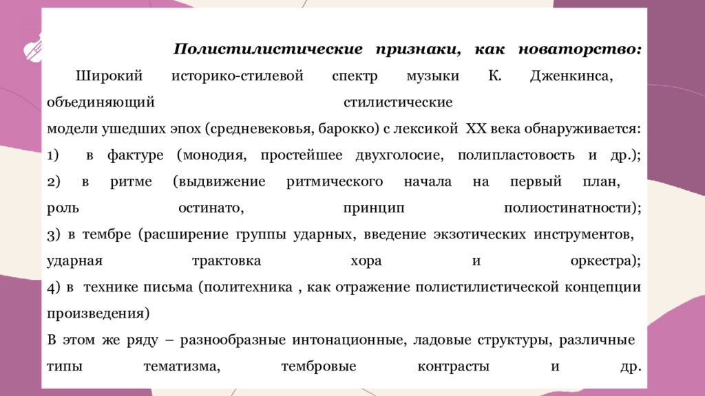 Полистилистические признаки, как новаторство: Широкий историко-стилевой спектр музыки К. Дженкинса, объединяющий стилистические модели ушедших эпох (средневековья, барокко) с лексикой XX века обнаруживается: 1) в фактуре (монодия, простейшее двухголосие, полипластовость и др.); 2) в ритме (выдвижение ритмического начала на первый план, роль остинато, принцип полиостинатности); 3) в тембре (расширение группы ударных, введение экзотических инструментов, ударная трактовка хора и оркестра); 4) в технике письма (политехника, как отражение полистилистической концепции произведения) В этом же ряду – разнообразные интонационные, ладовые структуры, различные типы тематизма, тембровые контрасты и др.