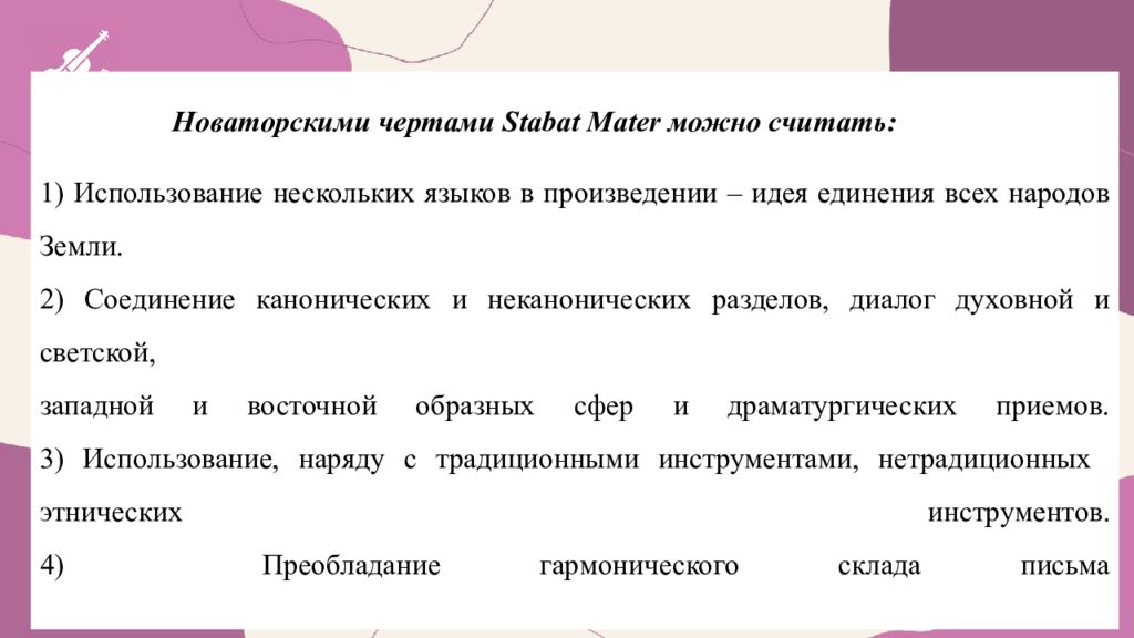Новаторскими чертами Stabat Mater можно считать: 1) Использование нескольких языков в произведении – идея единения всех народов Земли. 2) Соединение канонических и неканонических разделов, диалог духовной и светской, западной и восточной образных сфер и драматургических приемов. 3) Использование, наряду с традиционными инструментами, нетрадиционных этнических инструментов. 4) Преобладание гармонического склада письма