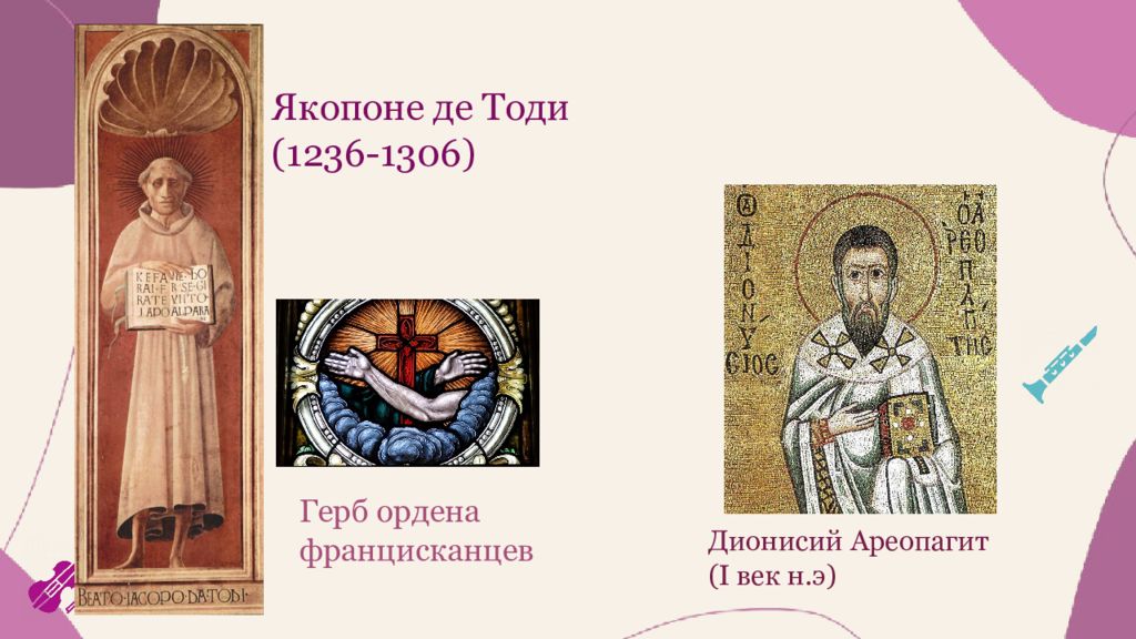 Якопоне де Тоди (1236-1306) Дионисий Ареопагит (I век н.э) Герб ордена францисканцев