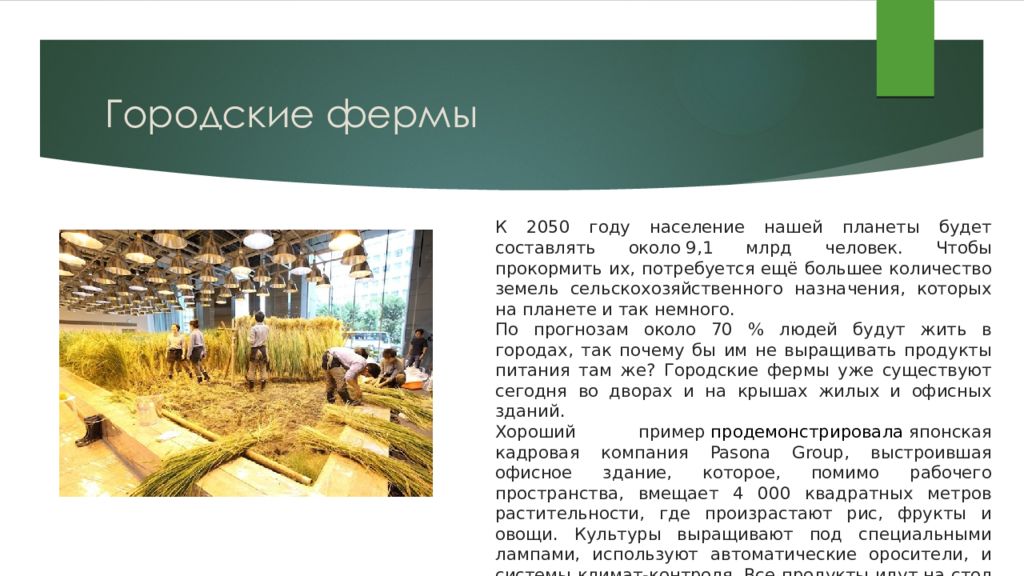 К 2050 году население нашей планеты будет составлять около 9,1 млрд человек. Чтобы прокормить их, потребуется ещё большее количество земель сельскохозяйственного назначения, которых на планете и так немного. По прогнозам около 70 % людей будут жить в городах, так почему бы им не выращивать продукты питания там же? Городские фермы уже существуют сегодня во дворах и на крышах жилых и офисных зданий. Хороший пример продемонстрировала японская кадровая компания Pasona Group, выстроившая офисное здание, которое, помимо рабочего пространства, вмещает 4 000 квадратных метров растительности, где произрастают рис, фрукты и овощи. Культуры выращивают под специальными лампами, используют автоматические оросители, и системы климат-контроля. Все продукты идут на стол в кафе для сотрудников.