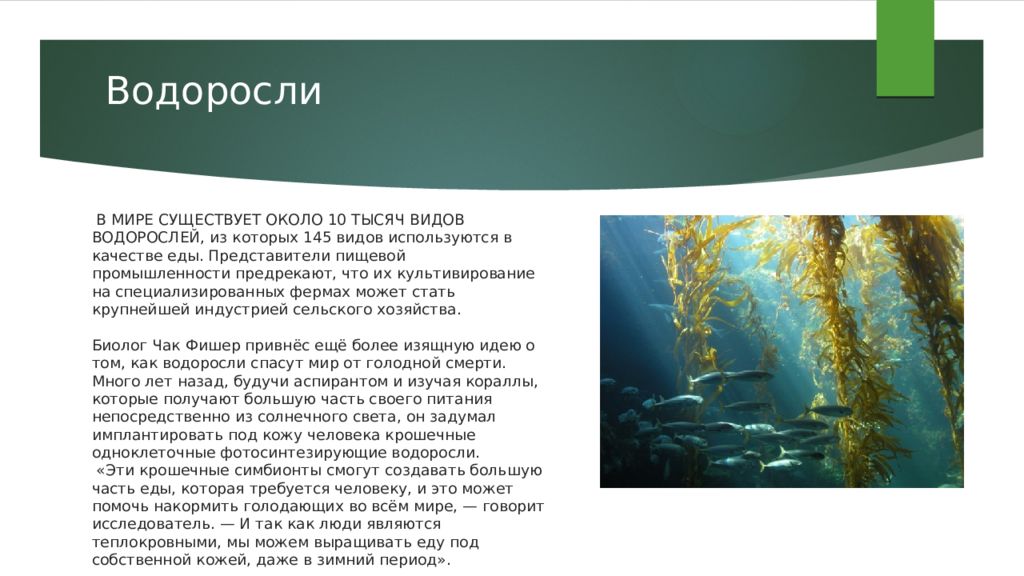 В МИРЕ СУЩЕСТВУЕТ ОКОЛО 10 ТЫСЯЧ ВИДОВ ВОДОРОСЛЕЙ, из которых 145 видов используются в качестве еды. Представители пищевой промышленности предрекают, что их культивирование на специализированных фермах может стать крупнейшей индустрией сельского хозяйства. Биолог Чак Фишер привнёс ещё более изящную идею о том, как водоросли спасут мир от голодной смерти. Много лет назад, будучи аспирантом и изучая кораллы, которые получают большую часть своего питания непосредственно из солнечного света, он задумал имплантировать под кожу человека крошечные одноклеточные фотосинтезирующие водоросли. «Эти крошечные симбионты смогут создавать большую часть еды, которая требуется человеку, и это может помочь накормить голодающих во всём мире, — говорит исследователь. — И так как люди являются теплокровными, мы можем выращивать еду под собственной кожей, даже в зимний период».