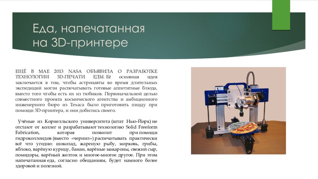 ЕЩЁ В МАЕ 2013 NASA ОБЪЯВИЛА О РАЗРАБОТКЕ ТЕХНОЛОГИИ 3D-ПЕЧАТИ ЕДЫ. Её основная идея заключается в том, чтобы астронавты во время длительных экспедиций могли распечатывать готовые аппетитные блюда, вместо того чтобы есть их из тюбиков. Первоначальной целью совместного проекта космического агентства и амбициозного инженерного бюро из Техаса было приготовить пиццу при помощи 3D-принтера, и они добились своего. Учёные из Корнелльского университета (штат Нью-Йорк) не отстают от коллег и разрабатывают технологию Solid Freeform Fabrication, которая позволит при помощи гидроколлоидов (вместо «чернил») распечатывать практически всё что угодно: шоколад, жареную рыбу, морковь, грибы, яблоко, варёную курицу, банан, варёные макароны, свежий сыр, помидоры, варёный желток и многое-многое другое. При этом напечатанная еда, согласно обещаниям, будет намного более здоровой и полезной.