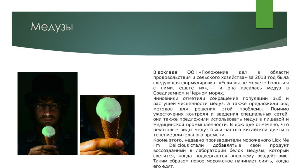 В докладе ООН «Положение дел в области продовольствия и сельского хозяйства» за 2013 год была следующая формулировка: «Если вы не можете бороться с ними, ешьте их», — и она касалась медуз в Средиземном и Черном морях. Чиновники отметили сокращение популяции рыб и растущей численности медуз, а также предложили ряд методов для решения этой проблемы. Помимо ужесточения контроля и введения специальных сетей, они также предложили использовать медуз в пищевой и медицинской промышленности. В докладе отмечено, что некоторые виды медуз были частью китайской диеты в течение длительного времени. Кроме этого, недавно производители мороженого Lick Me I'm Delicious стали добавлять в свой продукт воссозданный в лаборатории белок медузы, который светится, когда подвергается внешнему воздействию. Таким образом новое мороженое начинает сиять, когда его едят.