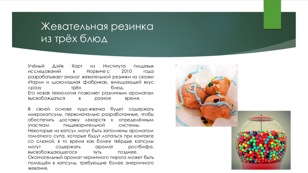 Жевательная резинка из трёх блюд Учёный Дэйв Харт из Института пищевых исследований в Норвиче с 2010 года разрабатывает аналог жевательной резинки из сказки «Чарли и шоколадная фабрика», вмещающей вкус сразу трёх блюд. Его новая технология позволяет различным ароматам высвобождаться в разное время. В своей основе чудо-жвачка будет содержать микрокапсулы, первоначально разработанные, чтобы обеспечить доставку лекарств к определённым участкам пищеварительной системы. Некоторые из капсул могут быть заполнены ароматом томатного супа, которые будут лопаться при контакте со слюной, в то время как более твёрдые капсулы могут содержать аромат ростбифа, высвобождающегося чуть позднее. Окончательный аромат черничного пирога может быть помещён в капсулы, требующие более энергичного жевания.