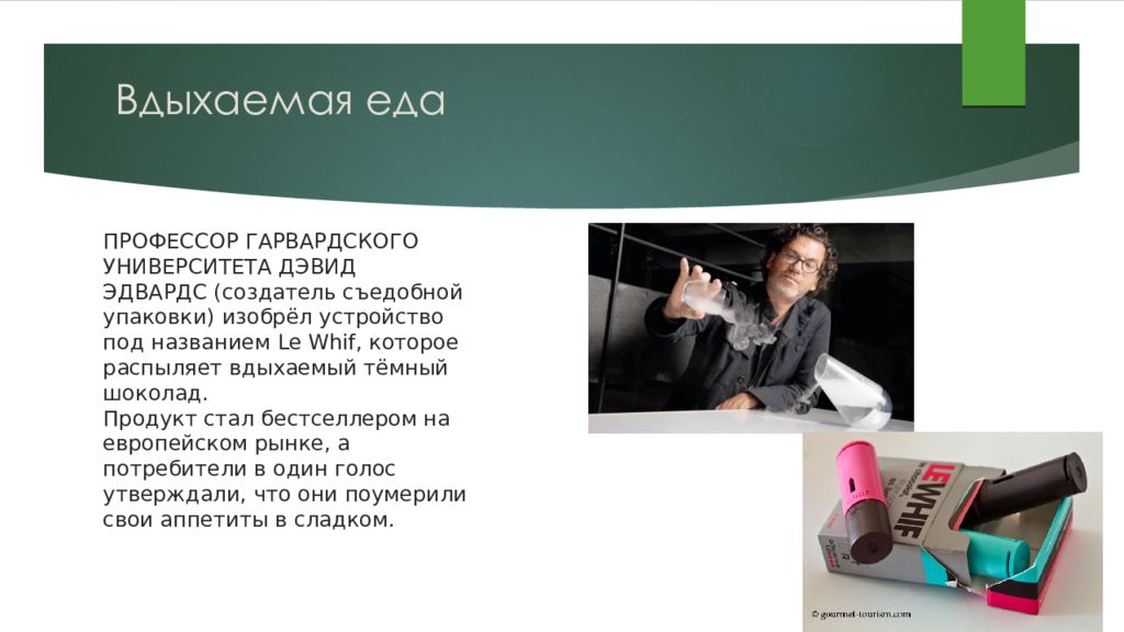 ПРОФЕССОР ГАРВАРДСКОГО УНИВЕРСИТЕТА ДЭВИД ЭДВАРДС (создатель съедобной упаковки) изобрёл устройство под названием Le Whif, которое распыляет вдыхаемый тёмный шоколад. Продукт стал бестселлером на европейском рынке, а потребители в один голос утверждали, что они поумерили свои аппетиты в сладком.