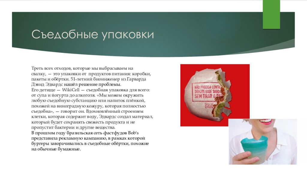 Треть всех отходов, которые мы выбрасываем на свалку, — это упаковки от продуктов питания: коробки, пакеты и обёртки. 51-летний биоинженер из Гарварда Дэвид Эдвардс нашёл решение проблемы. Его детище — WikiCell — съедобная упаковка для всего: от супа и йогурта до алкоголя. «Мы можем окружить любую съедобную субстанцию или напиток плёнкой, похожей на виноградную кожуру, которая полностью съедобна», — говорит он. Вдохновлённый строением клетки, которая содержит воду, Эдвардс создал материал, который будет сохранять свежесть продукта и не пропустит бактерии и другие вещества. В прошлом году бразильская сеть фастфудов Bob's представила рекламную кампанию, в рамках которой бургеры заворачивались в съедобные обёртки, похожие на обычные бумажные.
