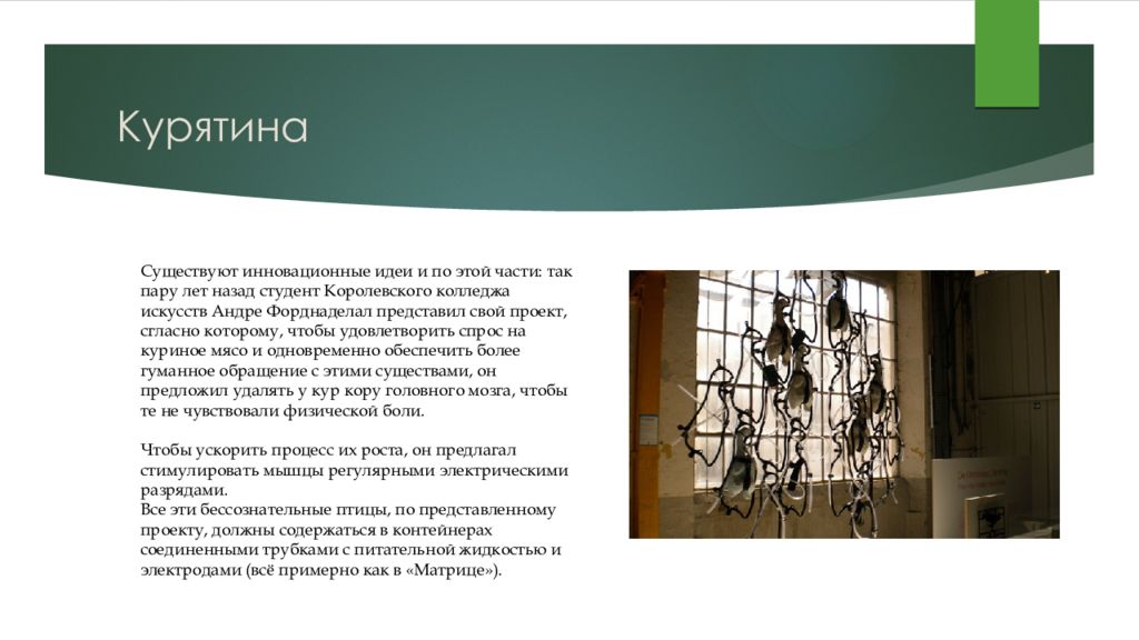 Существуют инновационные идеи и по этой части: так пару лет назад студент Королевского колледжа искусств Андре Форднаделал представил свой проект, сгласно которому, чтобы удовлетворить спрос на куриное мясо и одновременно обеспечить более гуманное обращение с этими существами, он предложил удалять у кур кору головного мозга, чтобы те не чувствовали физической боли. Чтобы ускорить процесс их роста, он предлагал стимулировать мышцы регулярными электрическими разрядами. Все эти бессознательные птицы, по представленному проекту, должны содержаться в контейнерах соединенными трубками с питательной жидкостью и электродами (всё примерно как в «Матрице»).