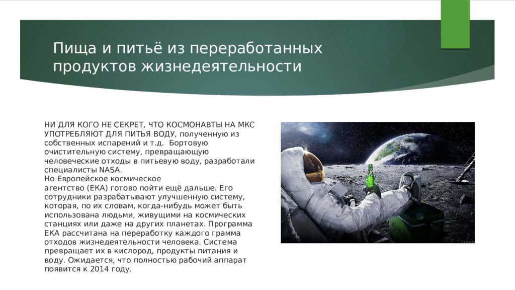 Слайд 13: Пища и питьё из переработанных продуктов жизнедеятельности