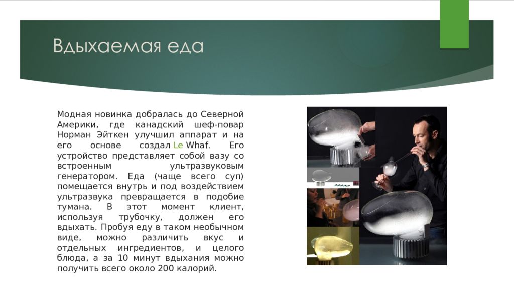 Модная новинка добралась до Северной Америки, где канадский шеф-повар Норман Эйткен улучшил аппарат и на его основе создал Le Whaf. Его устройство представляет собой вазу со встроенным ультразвуковым генератором. Еда (чаще всего суп) помещается внутрь и под воздействием ультразвука превращается в подобие тумана. В этот момент клиент, используя трубочку, должен его вдыхать. Пробуя еду в таком необычном виде, можно различить вкус и отдельных ингредиентов, и целого блюда, а за 10 минут вдыхания можно получить всего около 200 калорий.