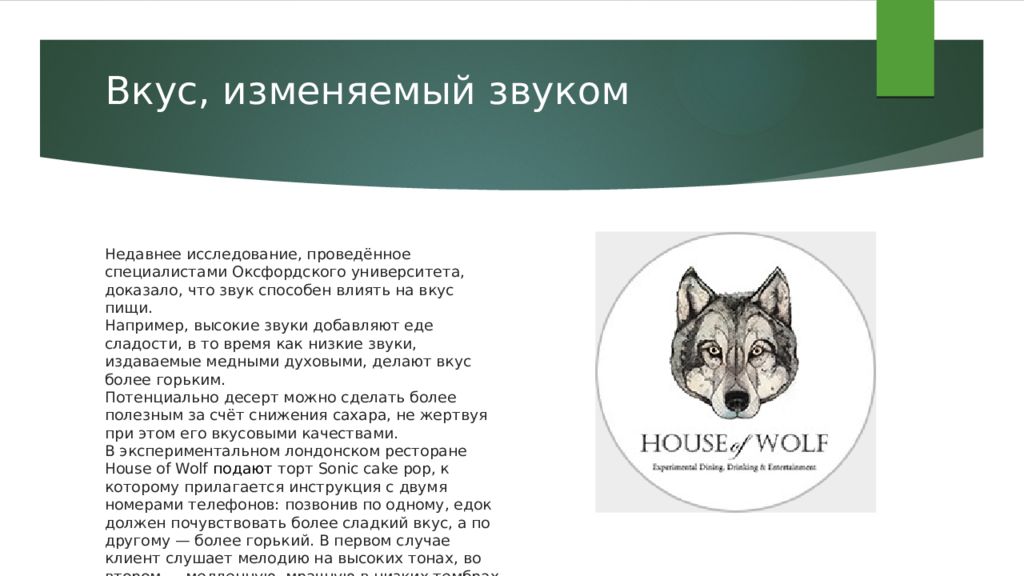 Недавнее исследование, проведённое специалистами Оксфордского университета, доказало, что звук способен влиять на вкус пищи. Например, высокие звуки добавляют еде сладости, в то время как низкие звуки, издаваемые медными духовыми, делают вкус более горьким. Потенциально десерт можно сделать более полезным за счёт снижения сахара, не жертвуя при этом его вкусовыми качествами. В экспериментальном лондонском ресторане House of Wolf подают торт Sonic cake pop, к которому прилагается инструкция с двумя номерами телефонов: позвонив по одному, едок должен почувствовать более сладкий вкус, а по другому — более горький. В первом случае клиент слушает мелодию на высоких тонах, во втором — медленную, мрачную в низких тембрах.