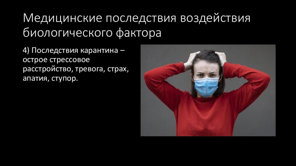 4) Последствия карантина – острое стрессовое расстройство, тревога, страх, апатия, ступор.