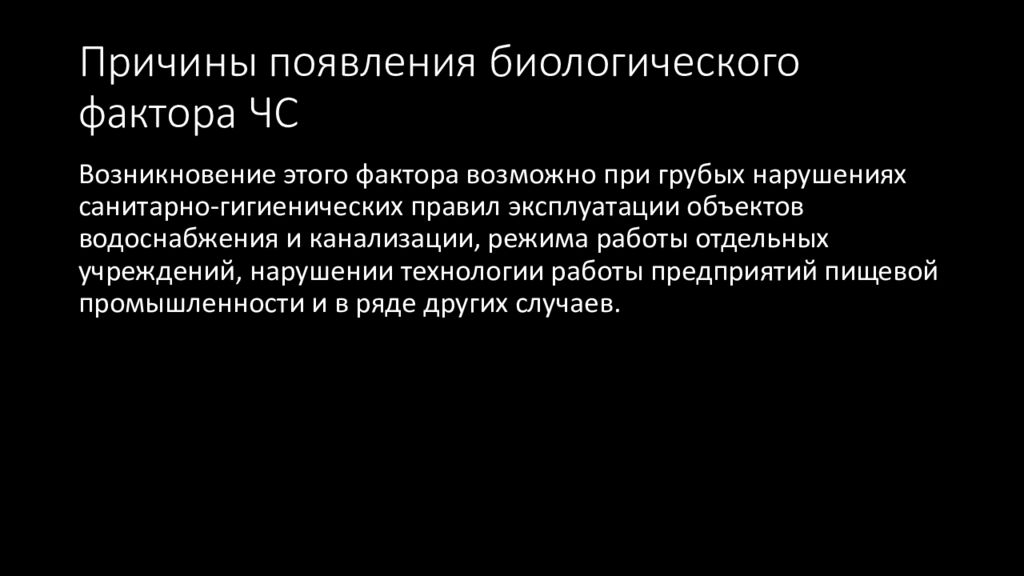 Возникновение этого фактора возможно при грубых нарушениях санитарно-гигиенических правил эксплуатации объектов водоснабжения и канализации, режима работы отдельных учреждений, нарушении технологии работы предприятий пищевой промышленности и в ряде других случаев.