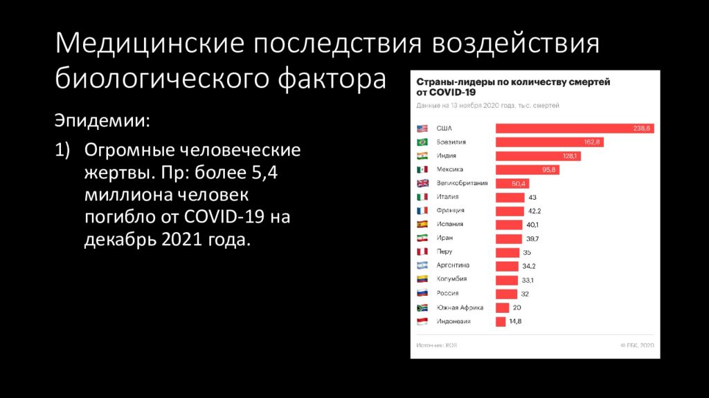 Эпидемии: Огромные человеческие жертвы. Пр : более 5,4 миллиона человек погибло от COVID-19 на декабрь 2021 года.