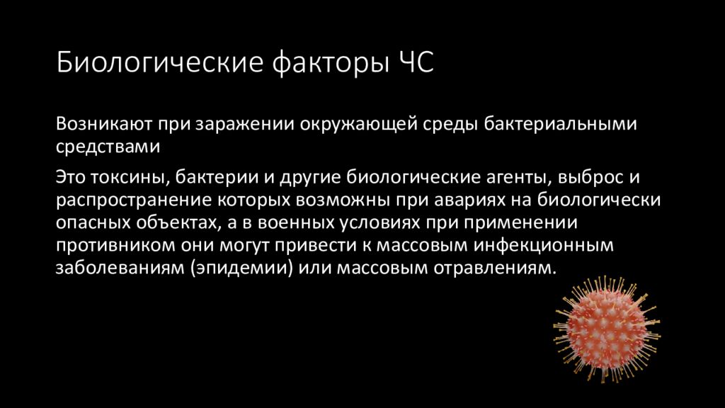 В озникают при заражении окружающей среды бактериальными средствами Это токсины, бактерии и другие биологические агенты, выброс и распространение которых возможны при авариях на биологически опасных объектах, а в военных условиях при применении противником они могут привести к массовым инфекционным заболеваниям (эпидемии) или массовым отравлениям.