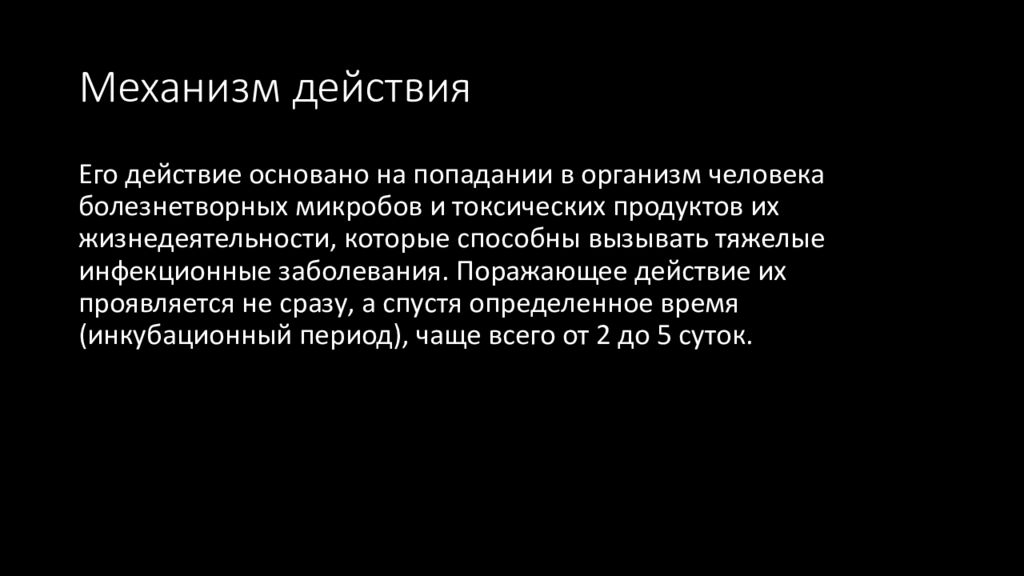 Его действие основано на попадании в организм человека болезнетворных микробов и токсических продуктов их жизнедеятельности, которые способны вызывать тяжелые инфекционные заболевания. Поражающее действие их проявляется не сразу, а спустя определенное время (инкубационный период), чаще всего от 2 до 5 суток.