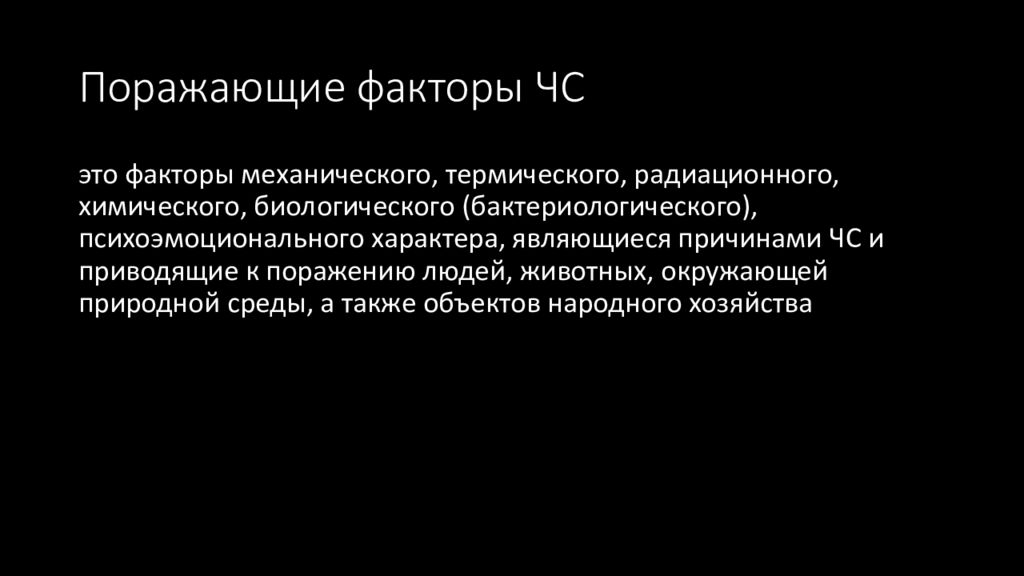 это факторы механического, термического, радиационного, химического, биологического (бактериологического), психоэмоционального характера, являющиеся причинами ЧС и приводящие к поражению людей, животных, окружающей природной среды, а также объектов народного хозяйства