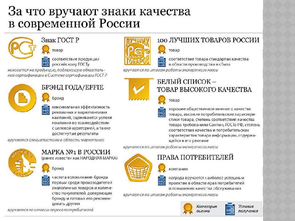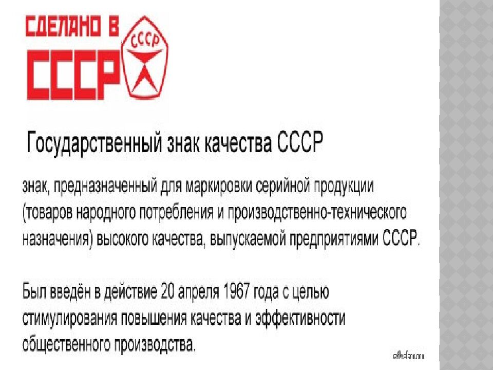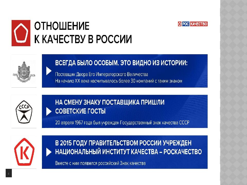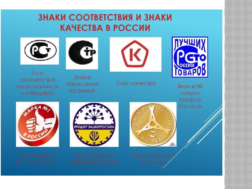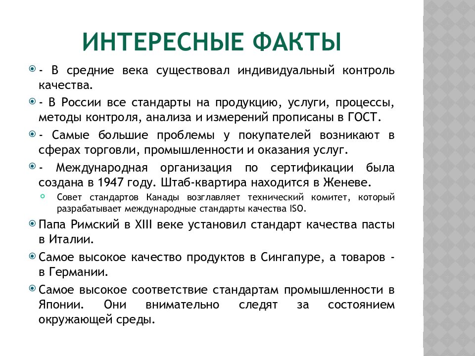 - В средние века существовал индивидуальный контроль качества. - В России все стандарты на продукцию, услуги, процессы, методы контроля, анализа и измерений прописаны в ГОСТ. - Самые большие проблемы у покупателей возникают в сферах торговли, промышленности и оказания услуг. - Международная организация по сертификации была создана в 1947 году. Штаб-квартира находится в Женеве. Совет стандартов Канады возглавляет технический комитет, который разрабатывает международные стандарты качества ISO. Папа Римский в XIII веке установил стандарт качества пасты в Италии. Самое высокое качество продуктов в Сингапуре, а товаров - в Германии. Самое высокое соответствие стандартам промышленности в Японии. Они внимательно следят за состоянием окружающей среды.