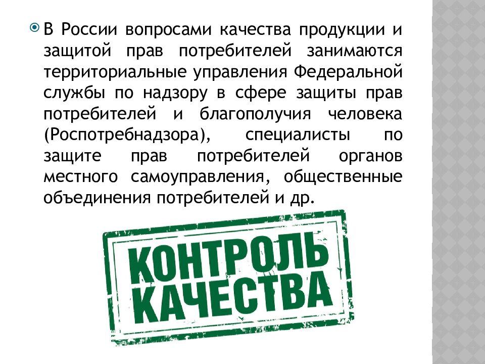 В России вопросами качества продукции и защитой прав потребителей занимаются территориальные управления Федеральной службы по надзору в сфере защиты прав потребителей и благополучия человека ( Роспотребнадзора ), специалисты по защите прав потребителей органов местного самоуправления, общественные объединения потребителей и др.