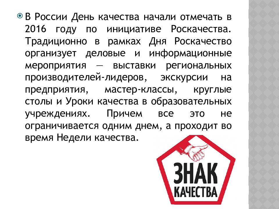 В России День качества начали отмечать в 2016 году по инициативе Роскачества. Традиционно в рамках Дня Роскачество организует деловые и информационные мероприятия — выставки региональных производителей-лидеров, экскурсии на предприятия, мастер-классы, круглые столы и Уроки качества в образовательных учреждениях. Причем все это не ограничивается одним днем, а проходит во время Недели качества.