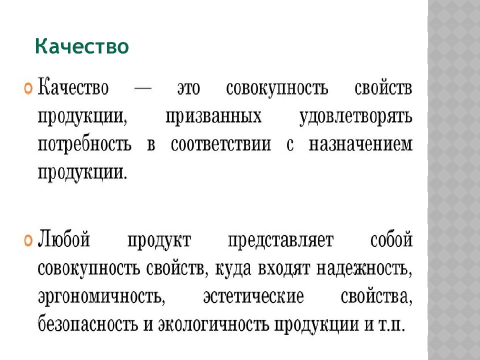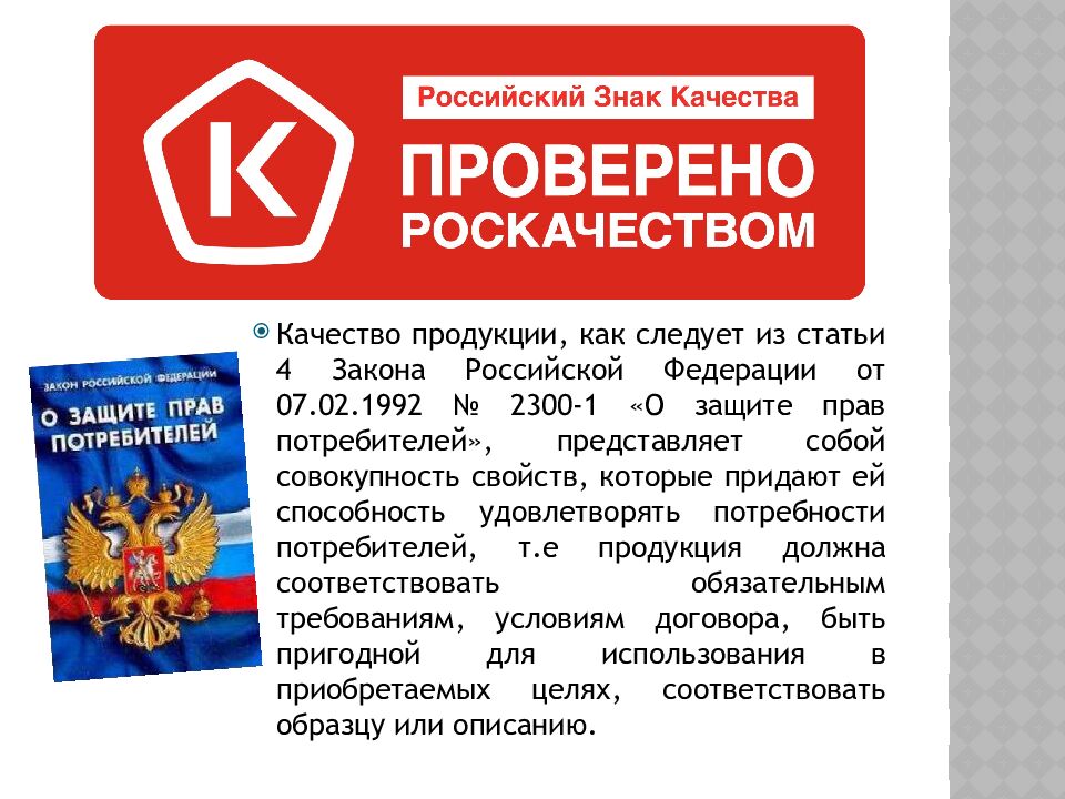 Качество продукции, как следует из статьи 4 Закона Российской Федерации от 07.02.1992 № 2300-1 «О защите прав потребителей», представляет собой совокупность свойств, которые придают ей способность удовлетворять потребности потребителей, т.е продукция должна соответствовать обязательным требованиям, условиям договора, быть пригодной для использования в приобретаемых целях, соответствовать образцу или описанию.