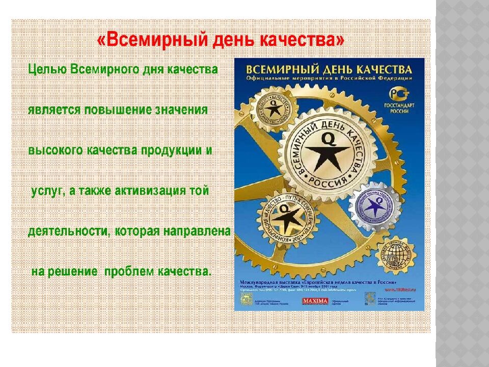 В 2023 году Всемирная неделя качества приходится на период 6-12 ноября, День качества - на 9 ноября. Всемирная неделя качества в этом году пройдет под девизом "Россия-страна со знаком качества».