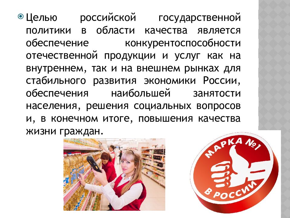 Целью российской государственной политики в области качества является обеспечение конкурентоспособности отечественной продукции и услуг как на внутреннем, так и на внешнем рынках для стабильного развития экономики России, обеспечения наибольшей занятости населения, решения социальных вопросов и, в конечном итоге, повышения качества жизни граждан.