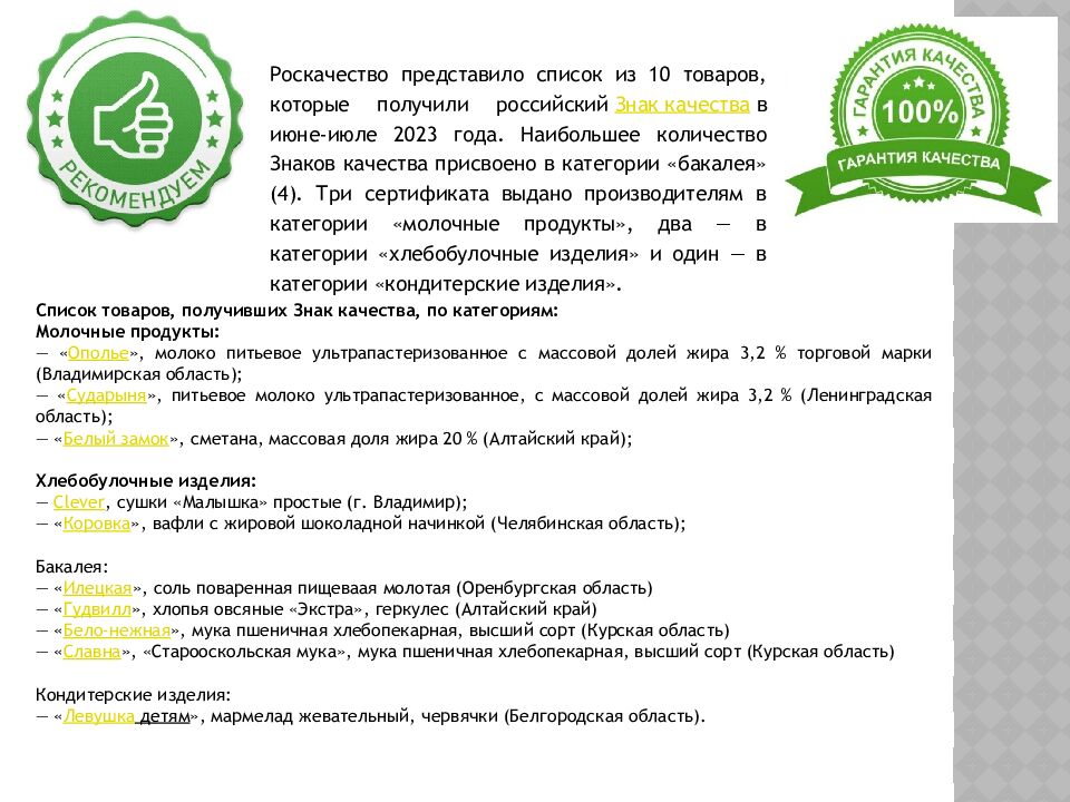 Список товаров, получивших Знак качества, по категориям: Молочные продукты: — « Ополье », молоко питьевое ультрапастеризованное с массовой долей жира 3,2 % торговой марки (Владимирская область); — « Сударыня », питьевое молоко ультрапастеризованное, с массовой долей жира 3,2 % (Ленинградская область); — « Белый замок », сметана, массовая доля жира 20 % (Алтайский край); Хлебобулочные изделия: — Clever, сушки «Малышка» простые (г. Владимир); — « Коровка », вафли с жировой шоколадной начинкой (Челябинская область); Бакалея: — « Илецкая », соль поваренная пищеваая молотая (Оренбургская область) — « Гудвилл », хлопья овсяные «Экстра», геркулес (Алтайский край) — « Бело-нежная », мука пшеничная хлебопекарная, высший сорт (Курская область) — « Славна », « Старооскольская мука», мука пшеничная хлебопекарная, высший сорт (Курская область) Кондитерские изделия: — « Левушка детям », мармелад жевательный, червячки (Белгородская область). Роскачество представило список из 10 товаров, которые получили российский Знак качества в июне-июле 2023 года. Наибольшее количество Знаков качества присвоено в категории «бакалея» (4). Три сертификата выдано производителям в категории «молочные продукты», два — в категории «хлебобулочные изделия» и один — в категории «кондитерские изделия».