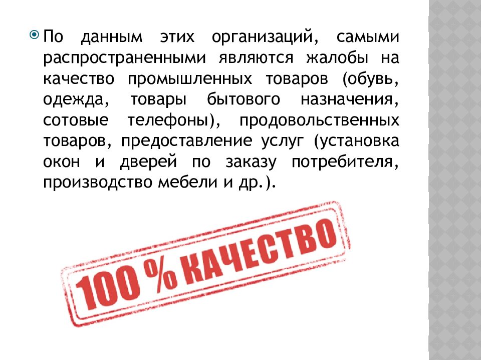 По данным этих организаций, самыми распространенными являются жалобы на качество промышленных товаров (обувь, одежда, товары бытового назначения, сотовые телефоны), продовольственных товаров, предоставление услуг (установка окон и дверей по заказу потребителя, производство мебели и др.).