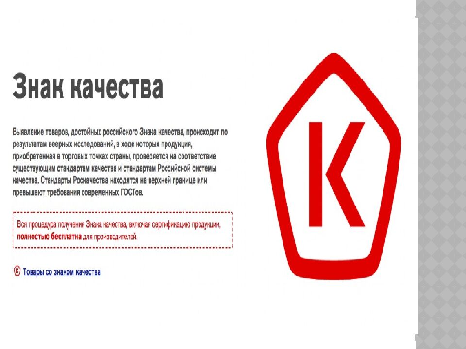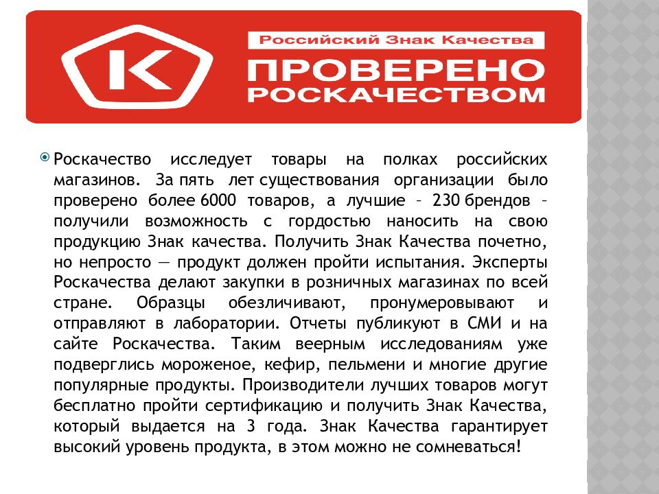 Роскачество исследует товары на полках российских магазинов. За пять лет существования организации было проверено более 6000 товаров, а лучшие – 230 брендов – получили возможность с гордостью наносить на свою продукцию Знак качества. Получить Знак Качества почетно, но непросто — продукт должен пройти испытания. Эксперты Роскачества делают закупки в розничных магазинах по всей стране. Образцы обезличивают, пронумеровывают и отправляют в лаборатории. Отчеты публикуют в СМИ и на сайте Роскачества. Таким веерным исследованиям уже подверглись мороженое, кефир, пельмени и многие другие популярные продукты. Производители лучших товаров могут бесплатно пройти сертификацию и получить Знак Качества, который выдается на 3 года. Знак Качества гарантирует высокий уровень продукта, в этом можно не сомневаться!
