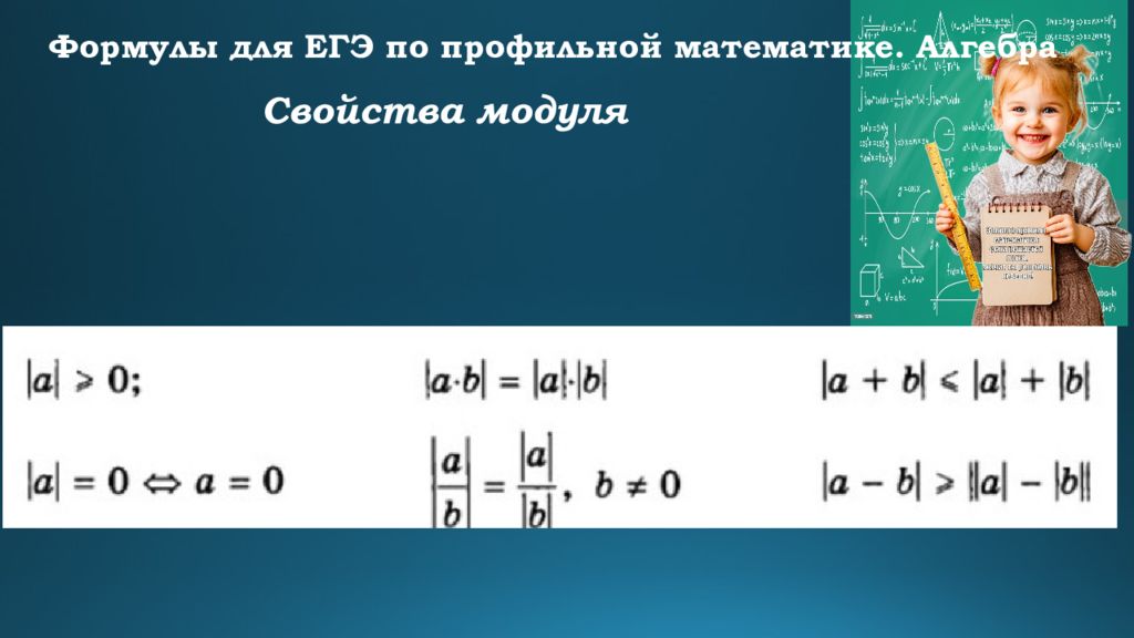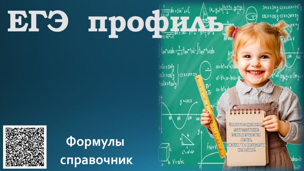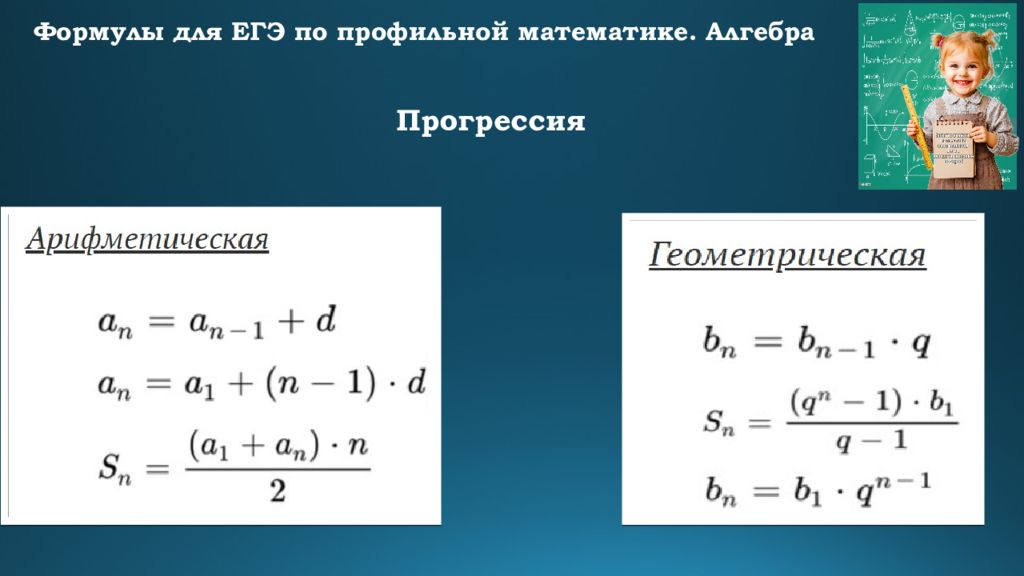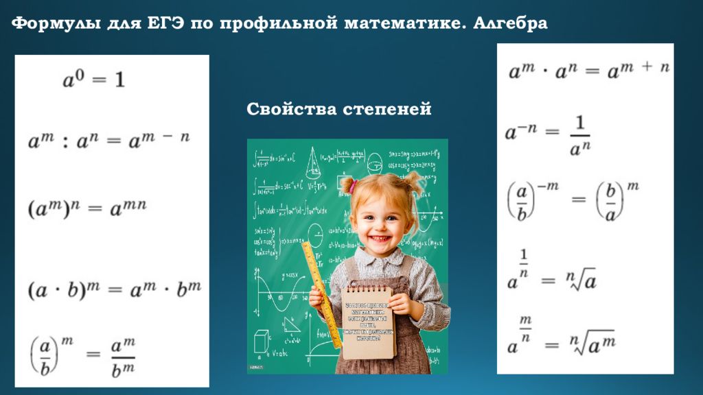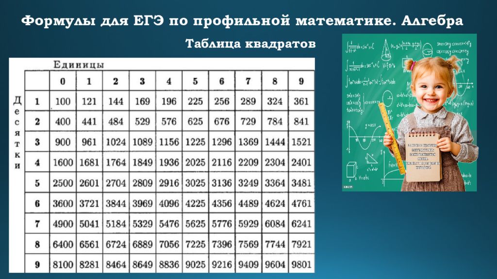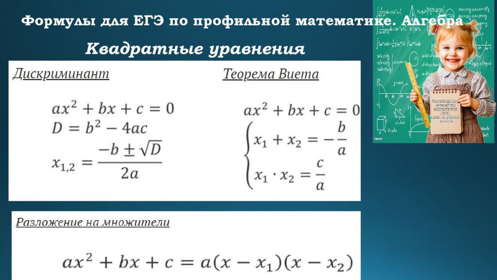 Формулы для ЕГЭ по профильной математике. Алгебра Формулы сокращенного умножения Квадрат суммы : ( a + b)² = a² + 2ab + b² Квадрат разности : ( a – b)² = a² – 2ab + b² Разность квадратов : a² – b² = (a + b)(a – b) Сумма кубов : a³ + b³ = (a + b)(a² – ab + b²) Разность кубов : a³ – b³ = (a – b)(a² + ab + b²)