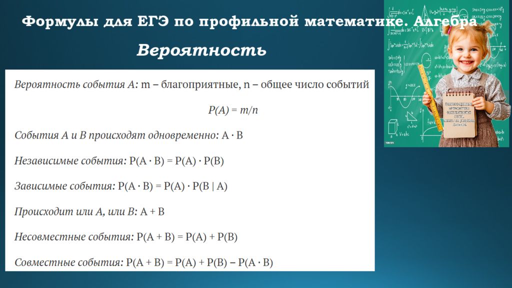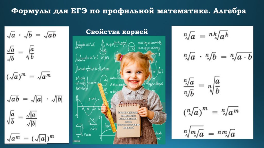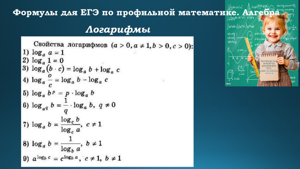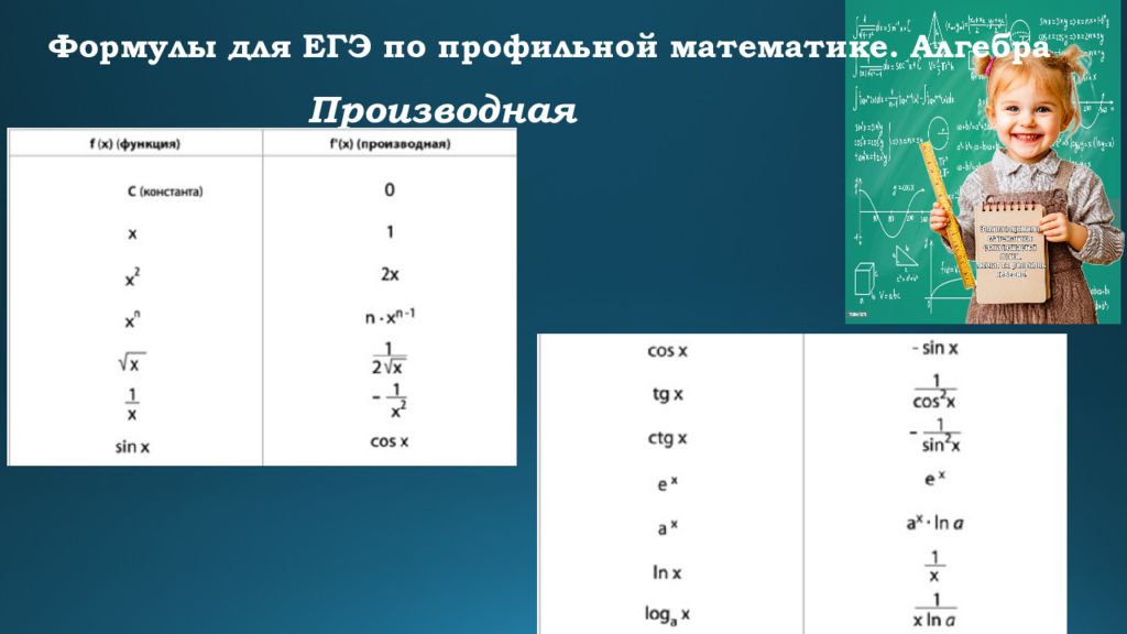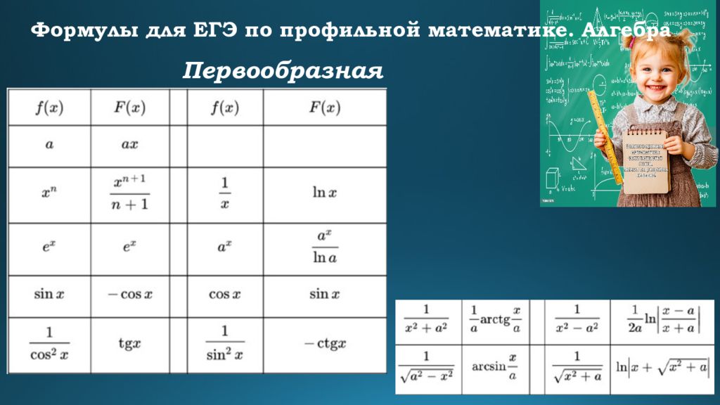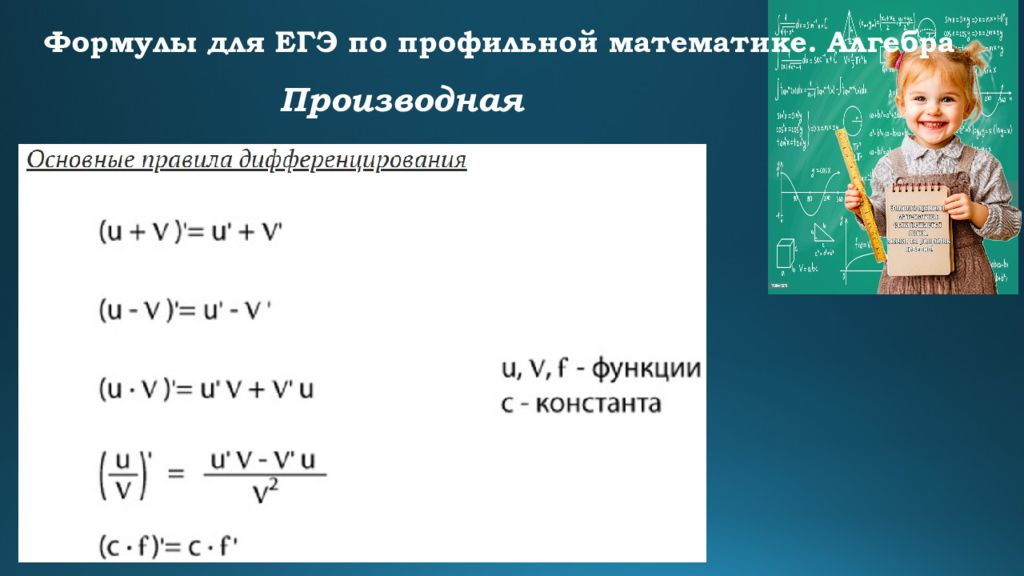 Формулы для ЕГЭ по профильной математике. Алгебра Формулы сокращенного умножения Квадрат суммы : ( a + b)² = a² + 2ab + b² Квадрат разности : ( a – b)² = a² – 2ab + b² Разность квадратов : a² – b² = (a + b)(a – b) Сумма кубов : a³ + b³ = (a + b)(a² – ab + b²) Разность кубов : a³ – b³ = (a – b)(a² + ab + b²)