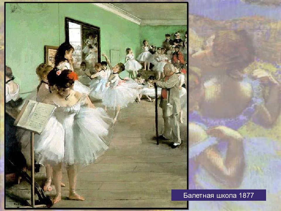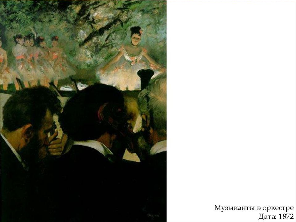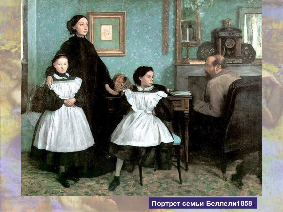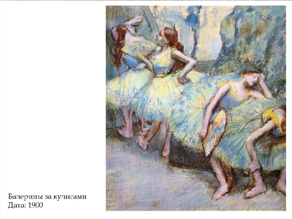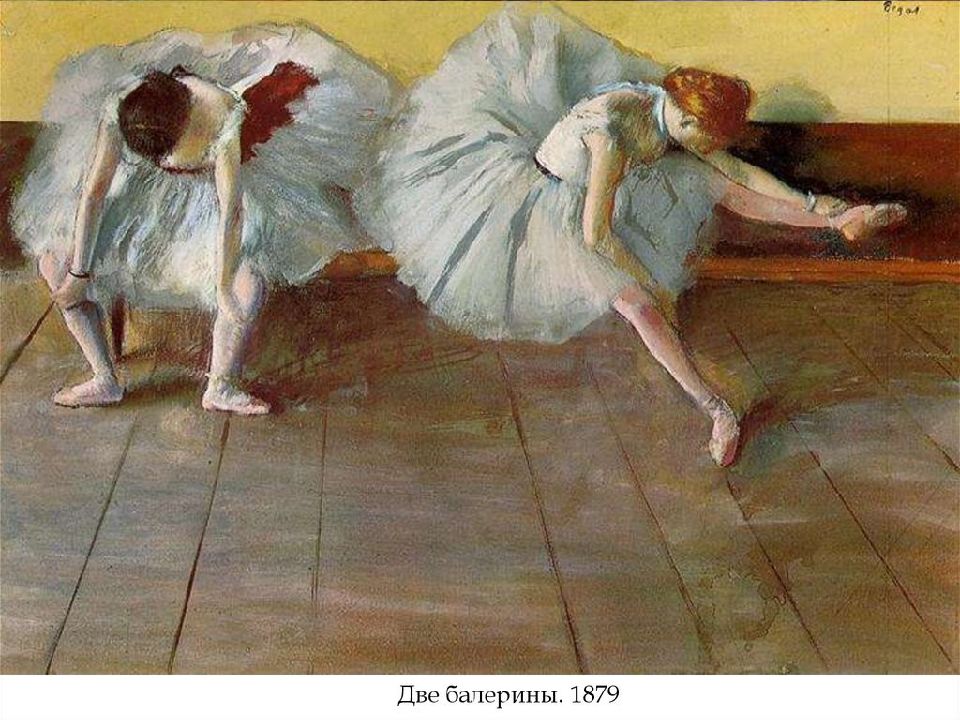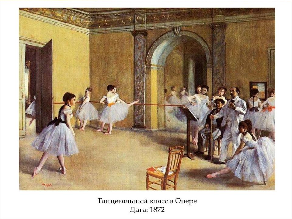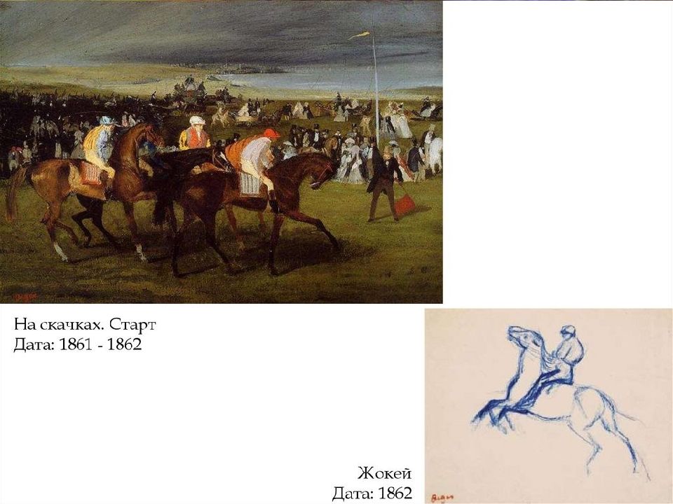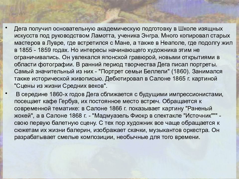 Дега получил основательную академическую подготовку в Школе изящных искусств под руководством Ламотта, ученика Энгра. Много копировал старых мастеров в Лувре, где встретился с Мане, а также в Неаполе, где подолгу жил в 1855 - 1859 годах. Но интересы начинающего художника этим не ограничивались. Он увлекался японской гравюрой, новыми открытиями в области фотографии. В ранний период творчества Дега писал портреты. Самый значительный из них - "Портрет семьи Беллели " (1860). Занимался также исторической живописью. Дебютировал в Салоне 1865 г. картиной "Сцены из жизни Средних веков". В середине 1860-х годов Дега сближается с будущими импрессионистами, посещает кафе Гербуа, их постоянное место встреч. Обращается к современной тематике: в Салоне 1866 г. показывает картину "Раненый жокей", а в Салоне 1868 г. - "Мадмуазель Фиокр в спектакле "Источник""" - свою первую балетную сцену. С тех пор художник все чаще обращается к сюжетам их жизни балерин, изображает скачки, музыкантов оркестра. Он разрабатывает смелые композиции, необычные для того времени.