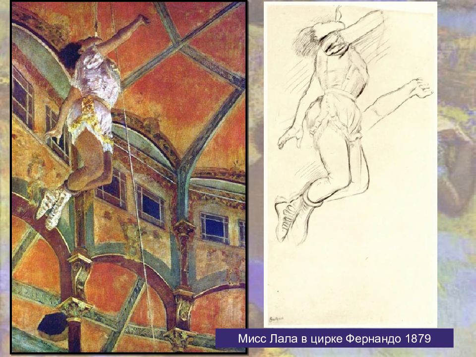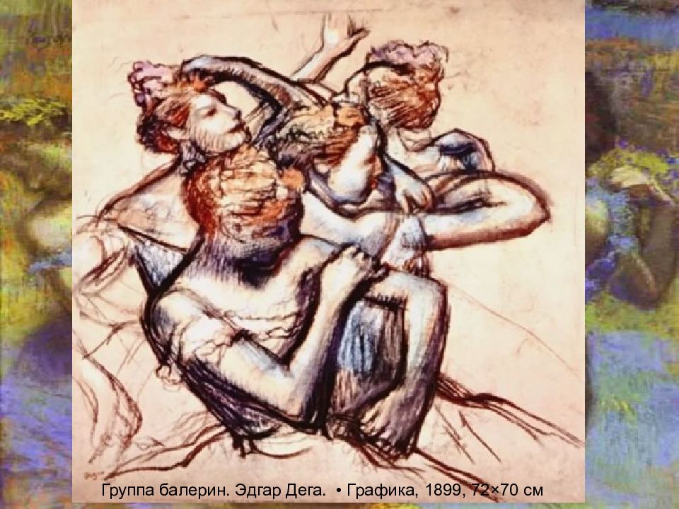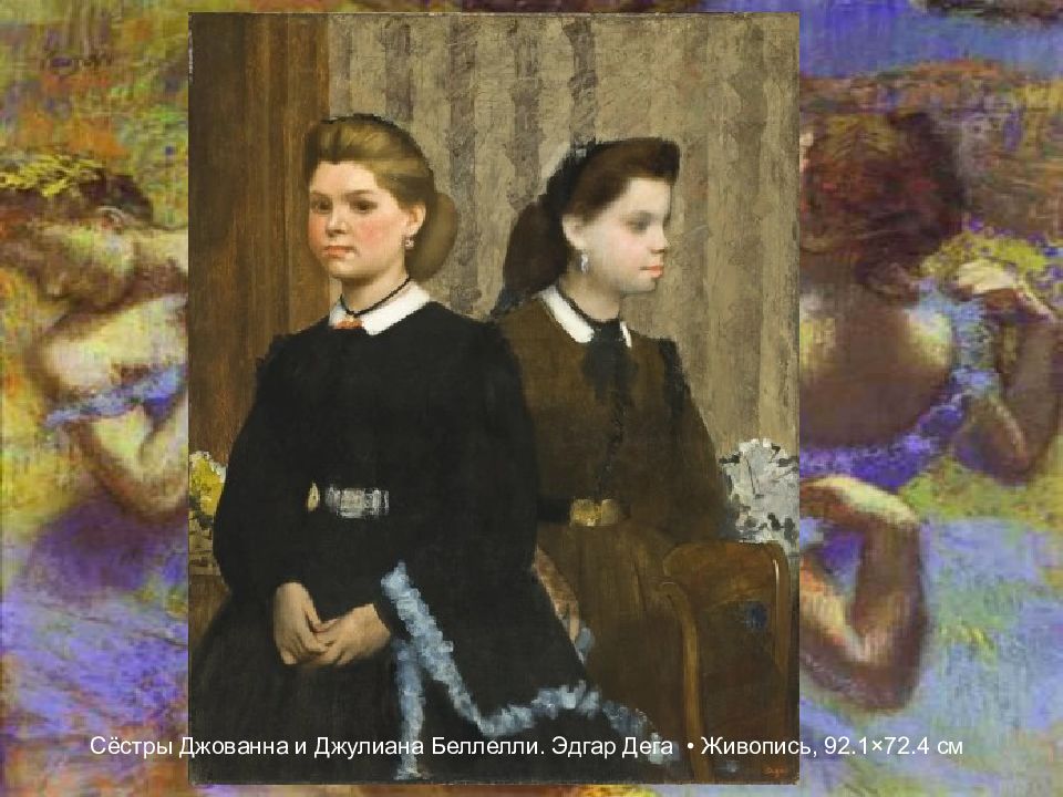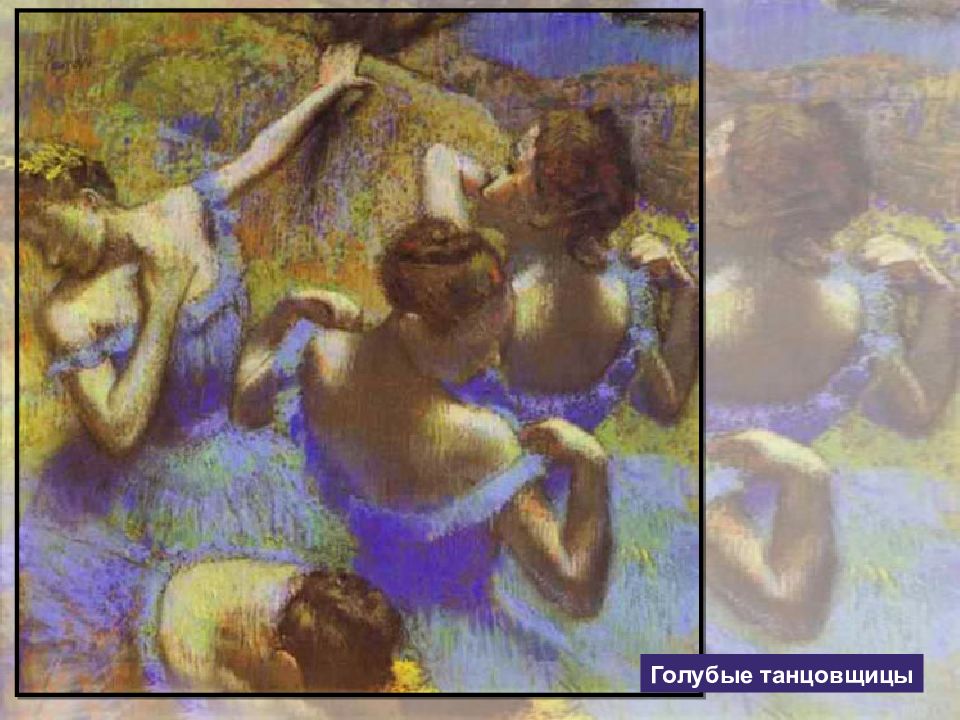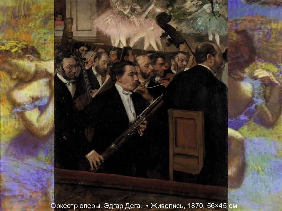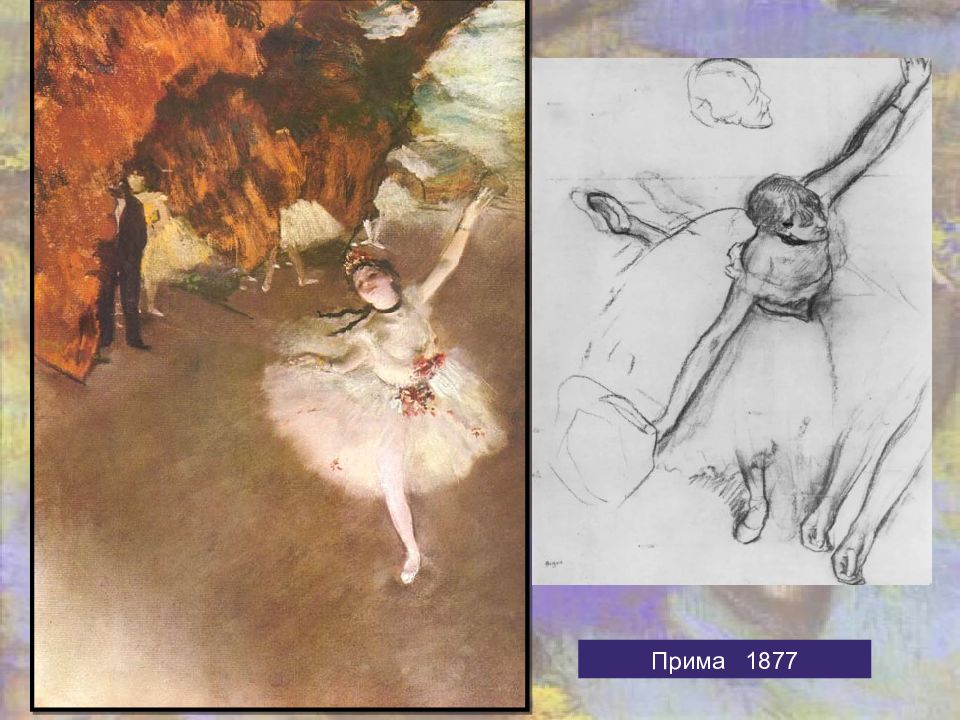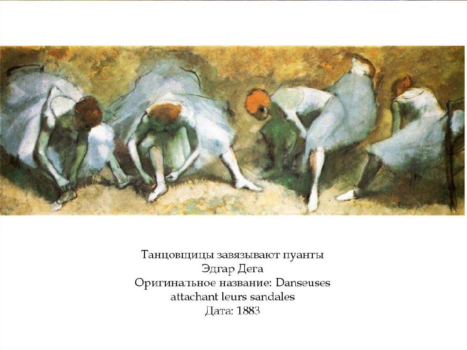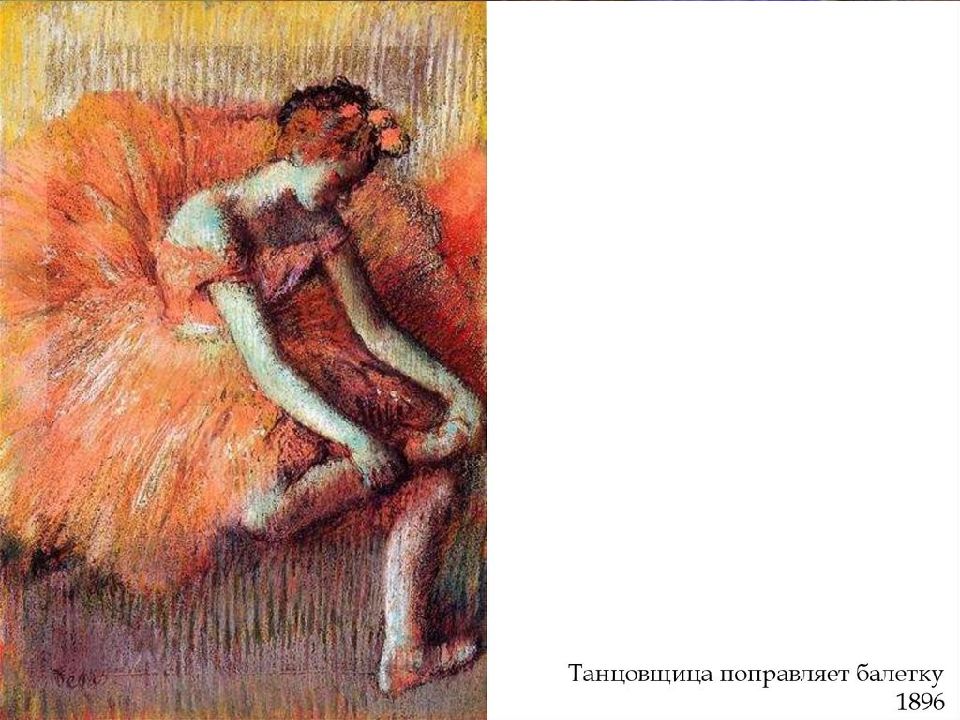 Дега получил основательную академическую подготовку в Школе изящных искусств под руководством Ламотта, ученика Энгра. Много копировал старых мастеров в Лувре, где встретился с Мане, а также в Неаполе, где подолгу жил в 1855 - 1859 годах. Но интересы начинающего художника этим не ограничивались. Он увлекался японской гравюрой, новыми открытиями в области фотографии. В ранний период творчества Дега писал портреты. Самый значительный из них - "Портрет семьи Беллели " (1860). Занимался также исторической живописью. Дебютировал в Салоне 1865 г. картиной "Сцены из жизни Средних веков". В середине 1860-х годов Дега сближается с будущими импрессионистами, посещает кафе Гербуа, их постоянное место встреч. Обращается к современной тематике: в Салоне 1866 г. показывает картину "Раненый жокей", а в Салоне 1868 г. - "Мадмуазель Фиокр в спектакле "Источник""" - свою первую балетную сцену. С тех пор художник все чаще обращается к сюжетам их жизни балерин, изображает скачки, музыкантов оркестра. Он разрабатывает смелые композиции, необычные для того времени.