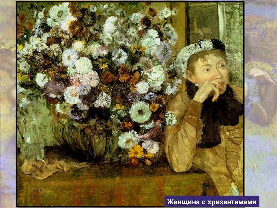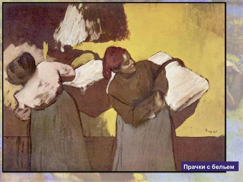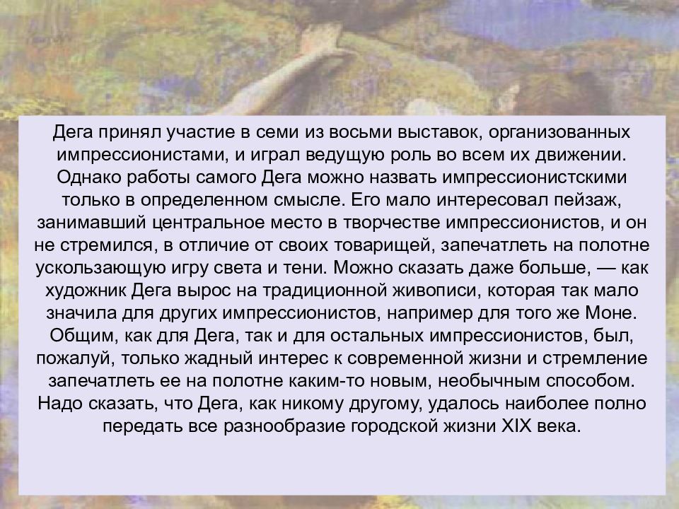 Дега принял участие в семи из восьми выставок, организованных импрессионистами, и играл ведущую роль во всем их движении. Однако работы самого Дега можно назвать импрессионистскими только в определенном смысле. Его мало интересовал пейзаж, занимавший центральное место в творчестве импрессионистов, и он не стремился, в отличие от своих товарищей, запечатлеть на полотне ускользающую игру света и тени. Можно сказать даже больше, — как художник Дега вырос на традиционной живописи, которая так мало значила для других импрессионистов, например для того же Моне. Общим, как для Дега, так и для остальных импрессионистов, был, пожалуй, только жадный интерес к современной жизни и стремление запечатлеть ее на полотне каким-то новым, необычным способом. Надо сказать, что Дега, как никому другому, удалось наиболее полно передать все разнообразие городской жизни XIX века.