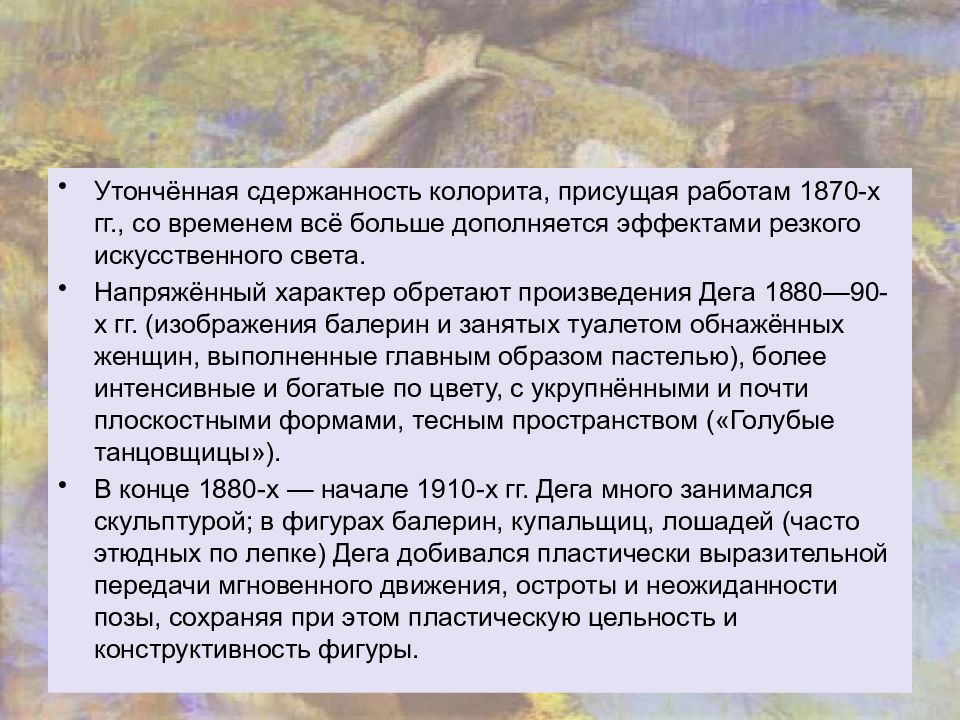 Утончённая сдержанность колорита, присущая работам 1870-х гг., со временем всё больше дополняется эффектами резкого искусственного света. Напряжённый характер обретают произведения Дега 1880—90-х гг. (изображения балерин и занятых туалетом обнажённых женщин, выполненные главным образом пастелью), более интенсивные и богатые по цвету, с укрупнёнными и почти плоскостными формами, тесным пространством («Голубые танцовщицы»). В конце 1880-х — начале 1910-х гг. Дега много занимался скульптурой; в фигурах балерин, купальщиц, лошадей (часто этюдных по лепке) Дега добивался пластически выразительной передачи мгновенного движения, остроты и неожиданности позы, сохраняя при этом пластическую цельность и конструктивность фигуры.