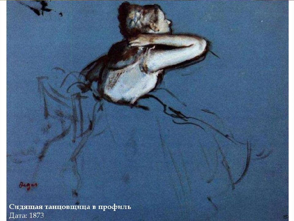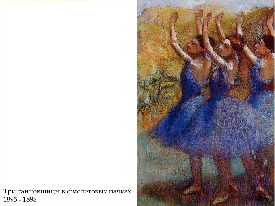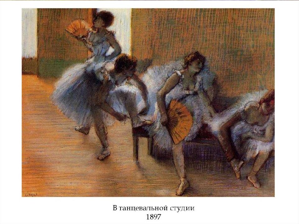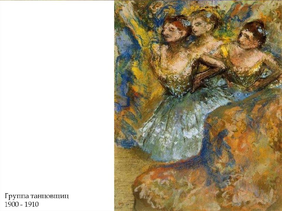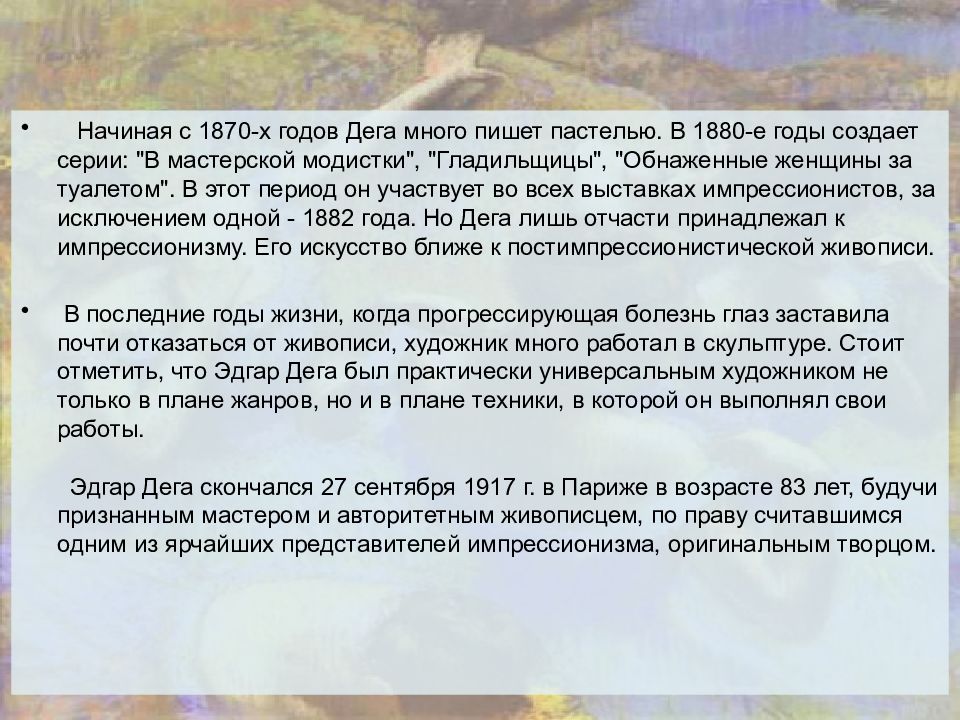 Начиная с 1870-х годов Дега много пишет пастелью. В 1880-е годы создает серии: "В мастерской модистки", "Гладильщицы", "Обнаженные женщины за туалетом". В этот период он участвует во всех выставках импрессионистов, за исключением одной - 1882 года. Но Дега лишь отчасти принадлежал к импрессионизму. Его искусство ближе к постимпрессионистической живописи. В последние годы жизни, когда прогрессирующая болезнь глаз заставила почти отказаться от живописи, художник много работал в скульптуре. Стоит отметить, что Эдгар Дега был практически универсальным художником не только в плане жанров, но и в плане техники, в которой он выполнял свои работы. Эдгар Дега скончался 27 сентября 1917 г. в Париже в возрасте 83 лет, будучи признанным мастером и авторитетным живописцем, по праву считавшимся одним из ярчайших представителей импрессионизма, оригинальным творцом.
