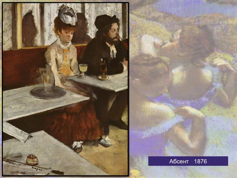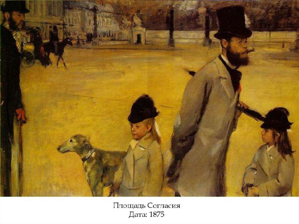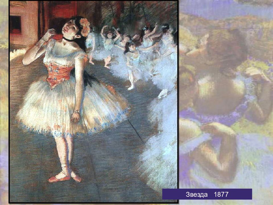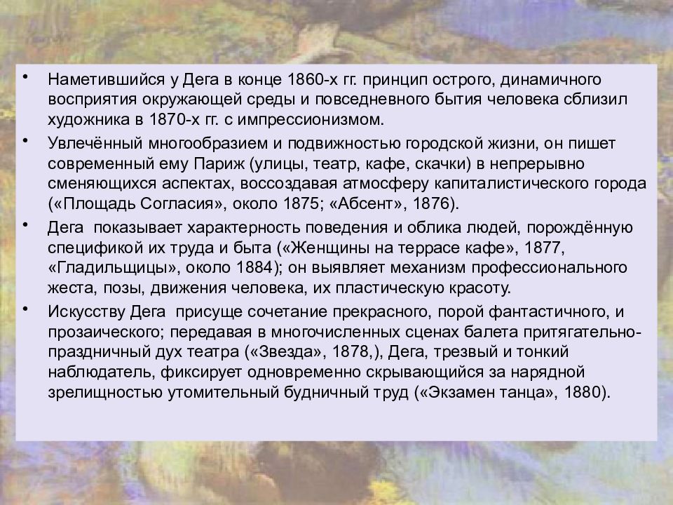 Наметившийся у Дега в конце 1860-х гг. принцип острого, динамичного восприятия окружающей среды и повседневного бытия человека сблизил художника в 1870-х гг. с импрессионизмом. Увлечённый многообразием и подвижностью городской жизни, он пишет современный ему Париж (улицы, театр, кафе, скачки) в непрерывно сменяющихся аспектах, воссоздавая атмосферу капиталистического города («Площадь Согласия», около 1875; «Абсент», 1876). Дега показывает характерность поведения и облика людей, порождённую спецификой их труда и быта («Женщины на террасе кафе», 1877, «Гладильщицы», около 1884); он выявляет механизм профессионального жеста, позы, движения человека, их пластическую красоту. Искусству Дега присуще сочетание прекрасного, порой фантастичного, и прозаического; передавая в многочисленных сценах балета притягательно-праздничный дух театра («Звезда», 1878,), Дега, трезвый и тонкий наблюдатель, фиксирует одновременно скрывающийся за нарядной зрелищностью утомительный будничный труд («Экзамен танца», 1880).
