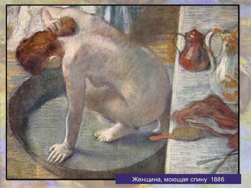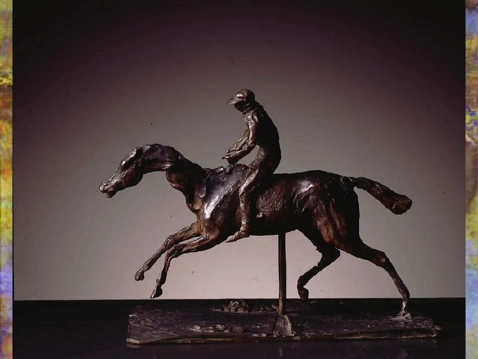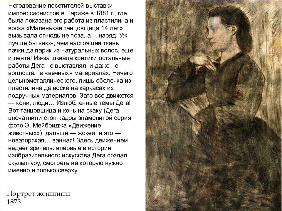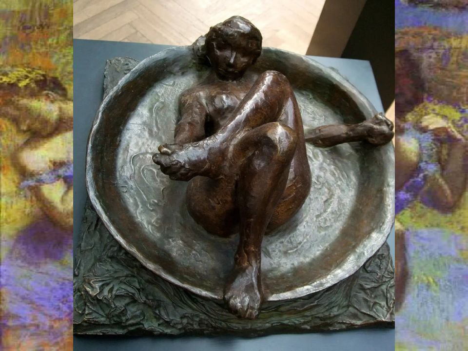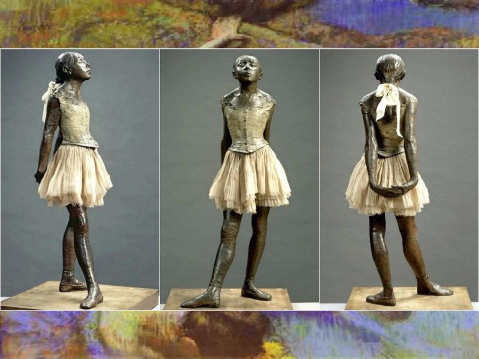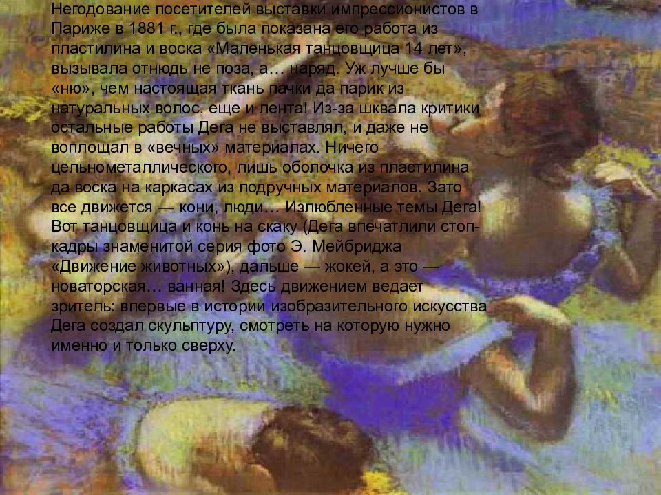 Негодование посетителей выставки импрессионистов в Париже в 1881 г., где была показана его работа из пластилина и воска «Маленькая танцовщица 14 лет», вызывала отнюдь не поза, а… наряд. Уж лучше бы «ню», чем настоящая ткань пачки да парик из натуральных волос, еще и лента! Из-за шквала критики остальные работы Дега не выставлял, и даже не воплощал в «вечных» материалах. Ничего цельнометаллического, лишь оболочка из пластилина да воска на каркасах из подручных материалов. Зато все движется — кони, люди… Излюбленные темы Дега! Вот танцовщица и конь на скаку (Дега впечатлили стоп-кадры знаменитой серия фото Э. Мейбриджа «Движение животных»), дальше — жокей, а это — новаторская… ванная! Здесь движением ведает зритель: впервые в истории изобразительного искусства Дега создал скульптуру, смотреть на которую нужно именно и только сверху.