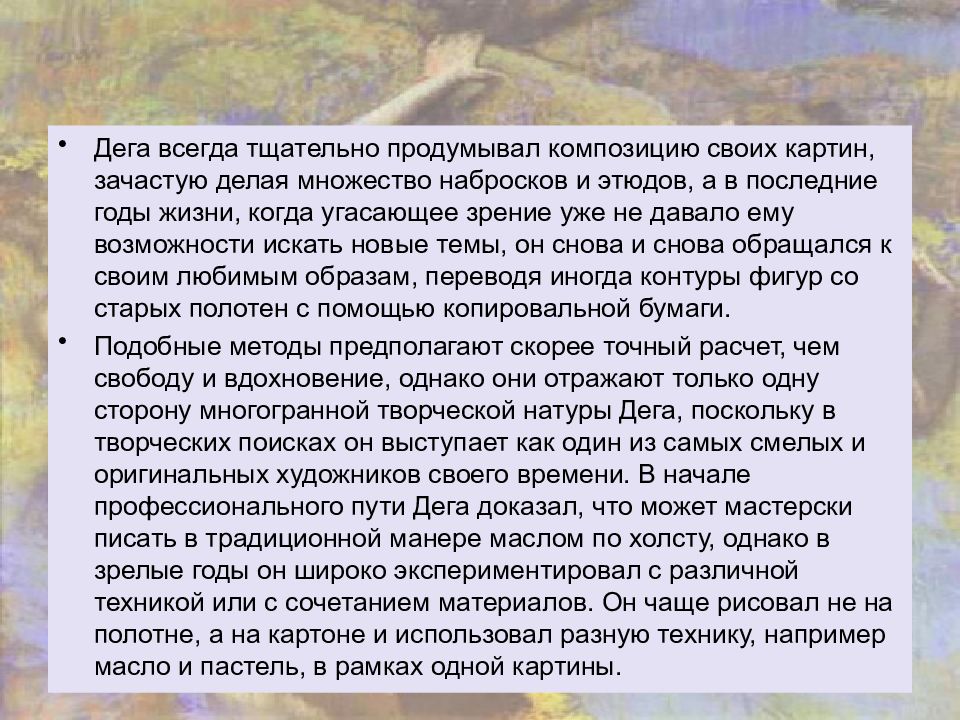 Дега всегда тщательно продумывал композицию своих картин, зачастую делая множество набросков и этюдов, а в последние годы жизни, когда угасающее зрение уже не давало ему возможности искать новые темы, он снова и снова обращался к своим любимым образам, переводя иногда контуры фигур со старых полотен с помощью копировальной бумаги. Подобные методы предполагают скорее точный расчет, чем свободу и вдохновение, однако они отражают только одну сторону многогранной творческой натуры Дега, поскольку в творческих поисках он выступает как один из самых смелых и оригинальных художников своего времени. В начале профессионального пути Дега доказал, что может мастерски писать в традиционной манере маслом по холсту, однако в зрелые годы он широко экспериментировал с различной техникой или с сочетанием материалов. Он чаще рисовал не на полотне, а на картоне и использовал разную технику, например масло и пастель, в рамках одной картины.