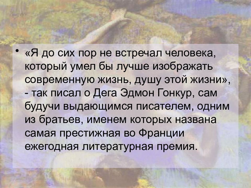 «Я до сих пор не встречал человека, который умел бы лучше изображать современную жизнь, душу этой жизни», - так писал о Дега Эдмон Гонкур, сам будучи выдающимся писателем, одним из братьев, именем которых названа самая престижная во Франции ежегодная литературная премия.