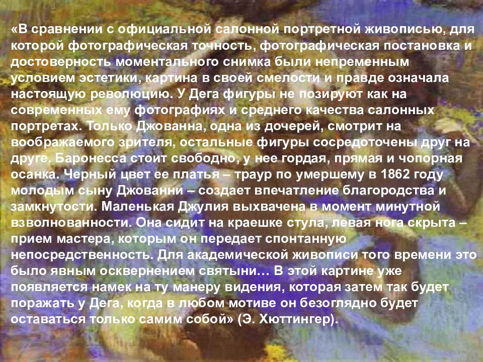 «В сравнении с официальной салонной портретной живописью, для которой фотографическая точность, фотографическая постановка и достоверность моментального снимка были непременным условием эстетики, картина в своей смелости и правде означала настоящую революцию. У Дега фигуры не позируют как на современных ему фотографиях и среднего качества салонных портретах. Только Джованна, одна из дочерей, смотрит на воображаемого зрителя, остальные фигуры сосредоточены друг на друге. Баронесса стоит свободно, у нее гордая, прямая и чопорная осанка. Черный цвет ее платья – траур по умершему в 1862 году молодым сыну Джованни – создает впечатление благородства и замкнутости. Маленькая Джулия выхвачена в момент минутной взволнованности. Она сидит на краешке стула, левая нога скрыта – прием мастера, которым он передает спонтанную непосредственность. Для академической живописи того времени это было явным осквернением святыни… В этой картине уже появляется намек на ту манеру видения, которая затем так будет поражать у Дега, когда в любом мотиве он безоглядно будет оставаться только самим собой» (Э. Хюттингер ).