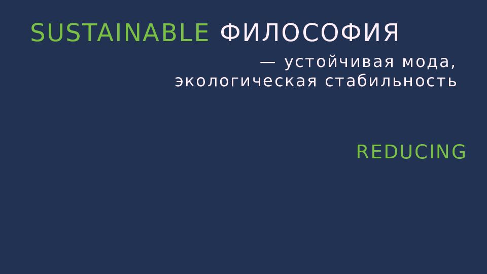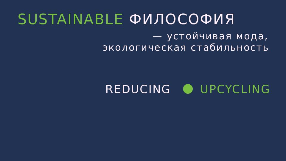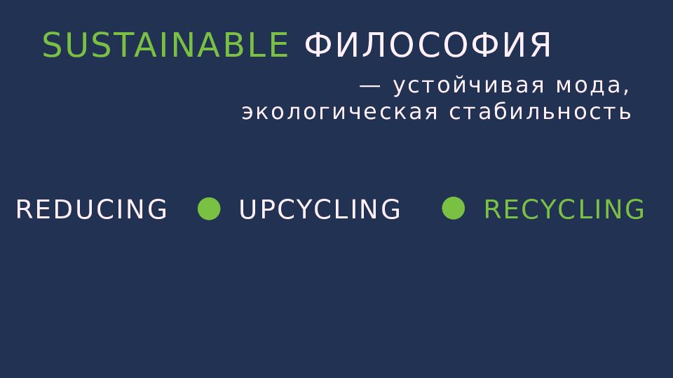 SUSTAINABLE ФИЛОСОФИЯ — устойчивая мода, экологическая стабильность REDUCING RECYLING UPCYCLING