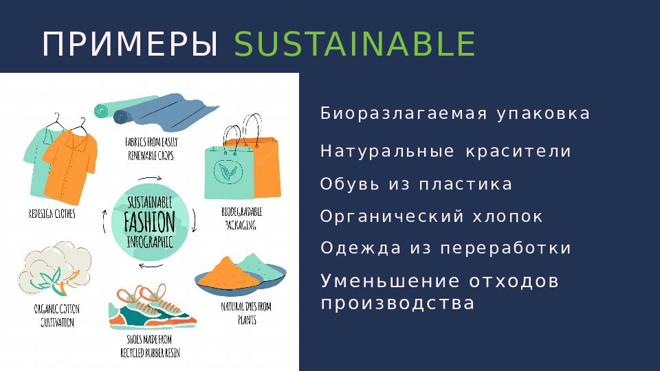 ПРИМЕРЫ SUSTAINABLE Биоразлагаемая упаковка Натуральные красители Обувь из пластика Органический хлопок Одежда из переработки Уменьшение отходов производства