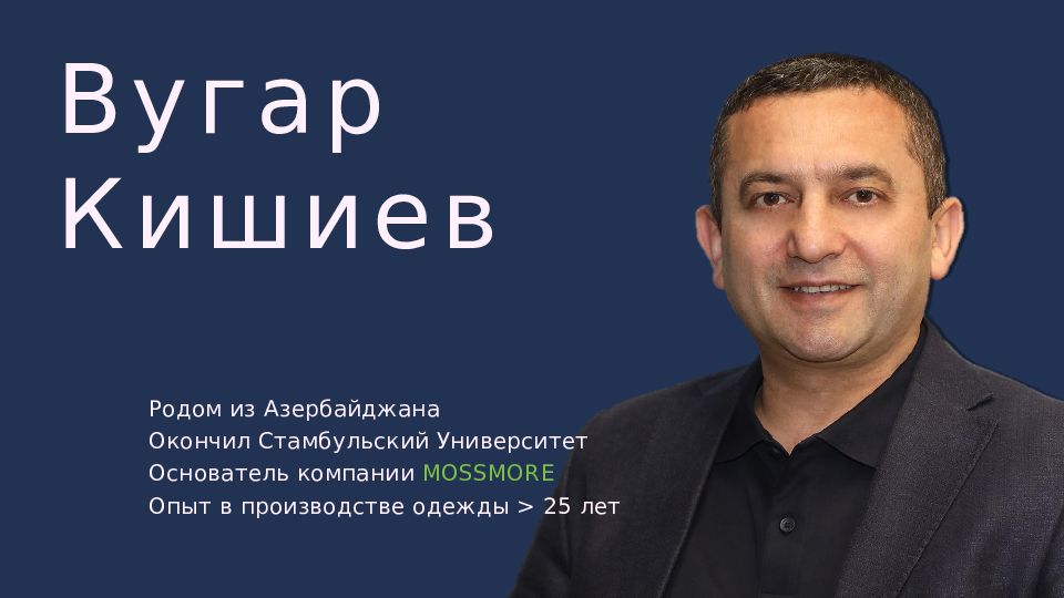 Вугар Кишиев Родом из Азербайджана Окончил Стамбульский Университет Основатель компании MOSSMORE Опыт в производстве одежды > 25 лет