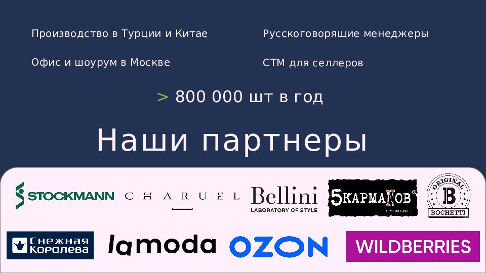 Наши партнеры Русскоговорящие менеджеры > 800 000 шт в год Офис и шоурум в Москве СТМ для селлеров Производство в Турции и Китае