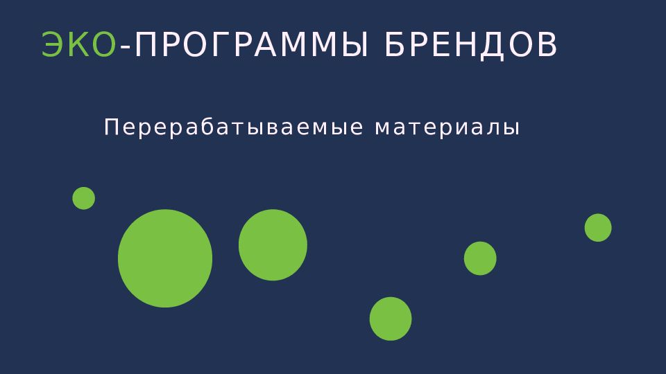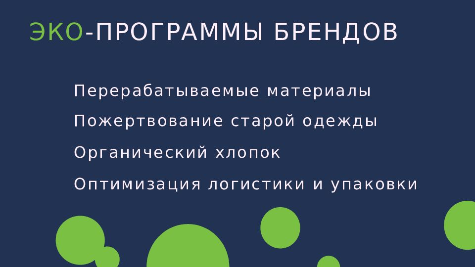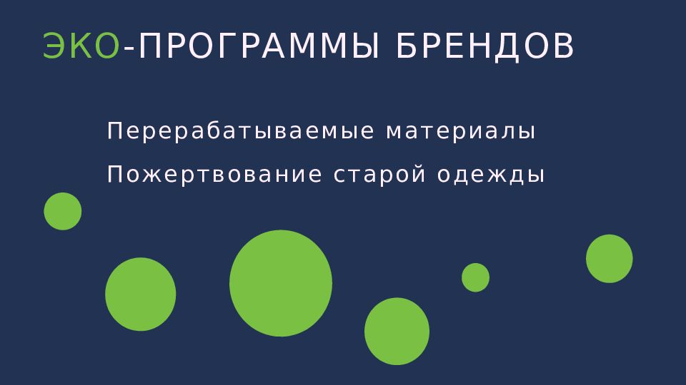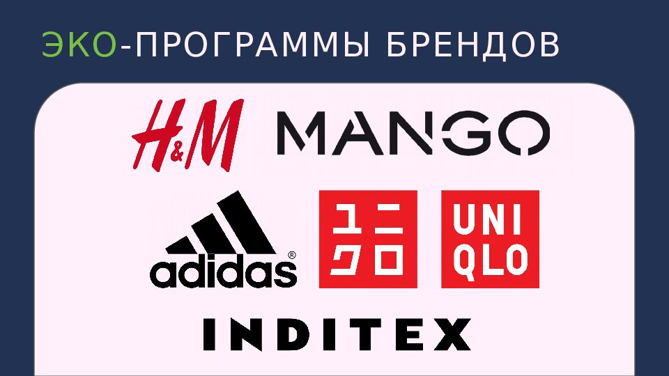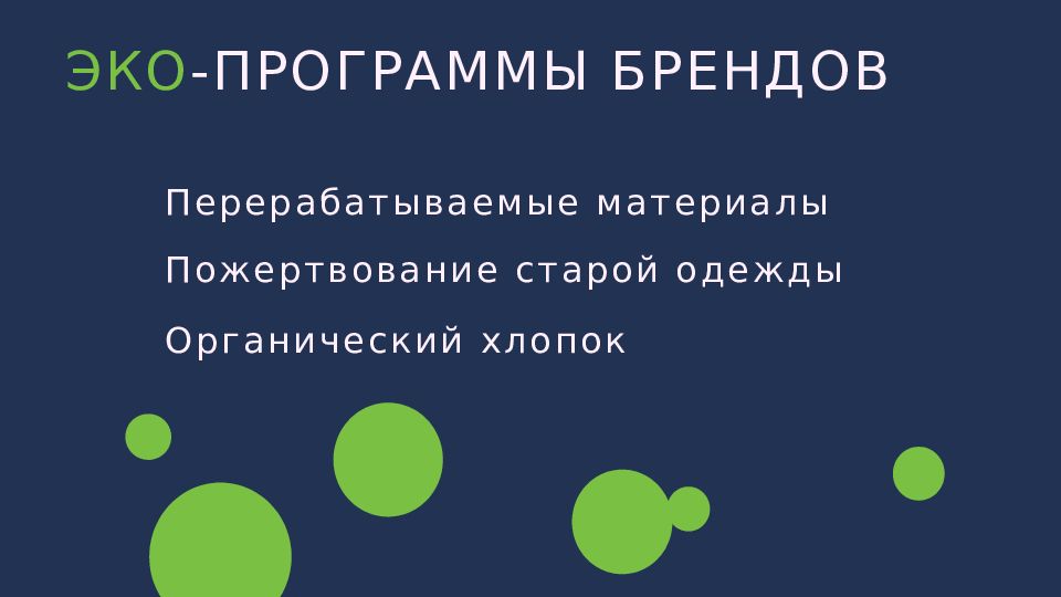ЭКО -ПРОГРАММЫ БРЕНДОВ Перерабатываемые материалы Пожертвование старой одежды Органический хлопок Оптимизация логистики и упаковки