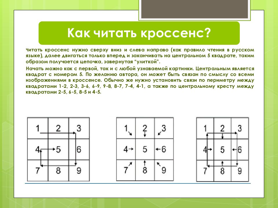 Ч итать кроссенс нужно сверху вниз и слева направо (как правило чтения в русском языке), далее двигаться только вперед и заканчивать на центральном 5 квадрате, таким образом получается цепочка, завернутая “улиткой”. Начать можно как с первой, так и с любой узнаваемой картинки. Центральным является квадрат с номером 5. По желанию автора, он может быть связан по смыслу со всеми изображениями в кроссенсе. Обычно же нужно установить связи по периметру между квадратами 1-2, 2-3, 3-6, 6-9, 9-8, 8-7, 7-4, 4-1, а также по центральному кресту между квадратами 2-5, 6-5, 8-5 и 4-5.