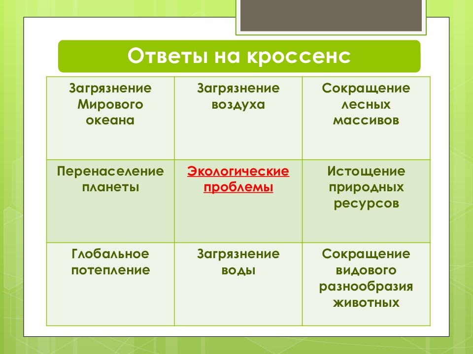 Загрязнение Мирового океана Загрязнение воздуха Сокращение лесных массивов Перенаселение планеты Экологические проблемы Истощение природных ресурсов Глобальное потепление Загрязнение воды Сокращение видового разнообразия животных