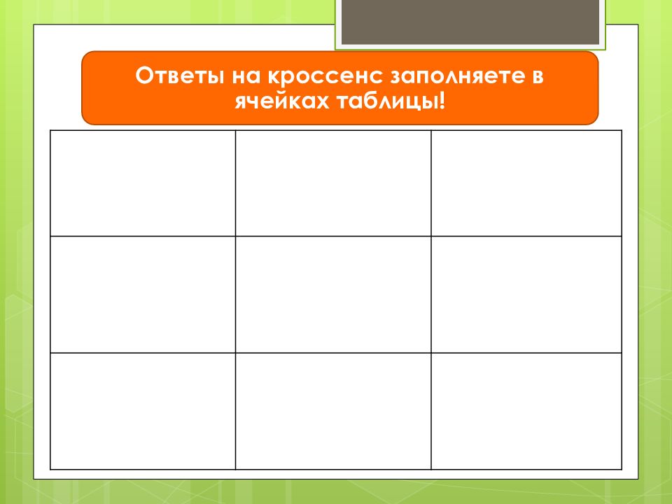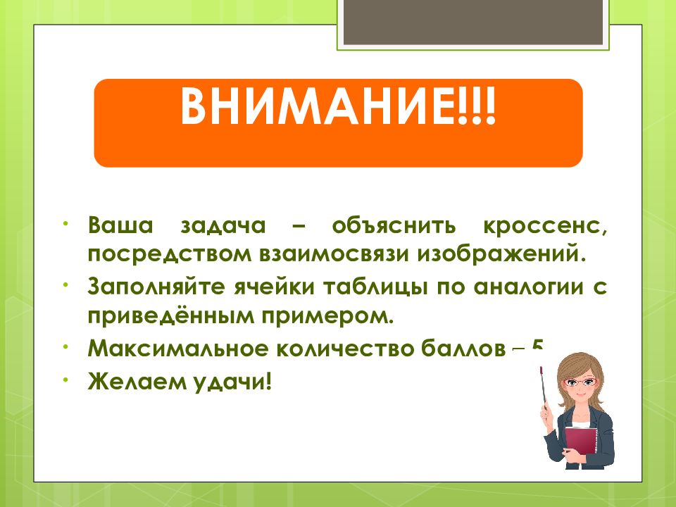 Ваша задача – объяснить кроссенс, посредством взаимосвязи изображений. Заполняйте ячейки таблицы по аналогии с приведённым примером. Максимальное количество баллов – 5. Желаем удачи!