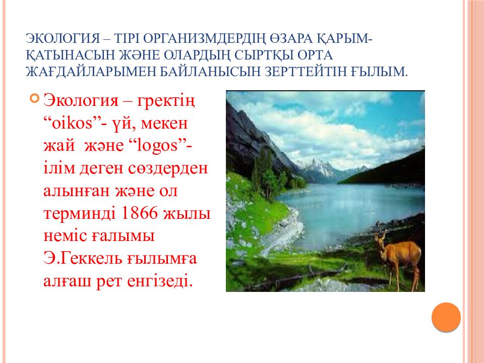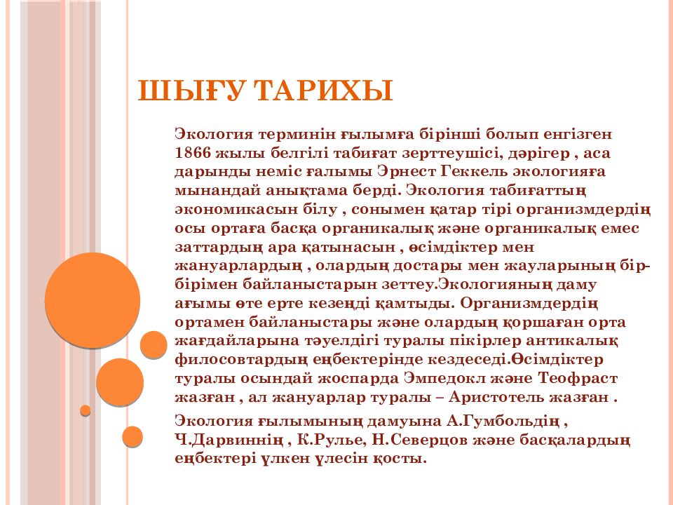 Экология – гректің “ oikos ” - үй, мекен жай және “ logos ”- ілім деген сөздерден алынған және ол терминді 1866 жылы неміс ғалымы Э.Геккель ғылымға алғаш рет енгізеді.